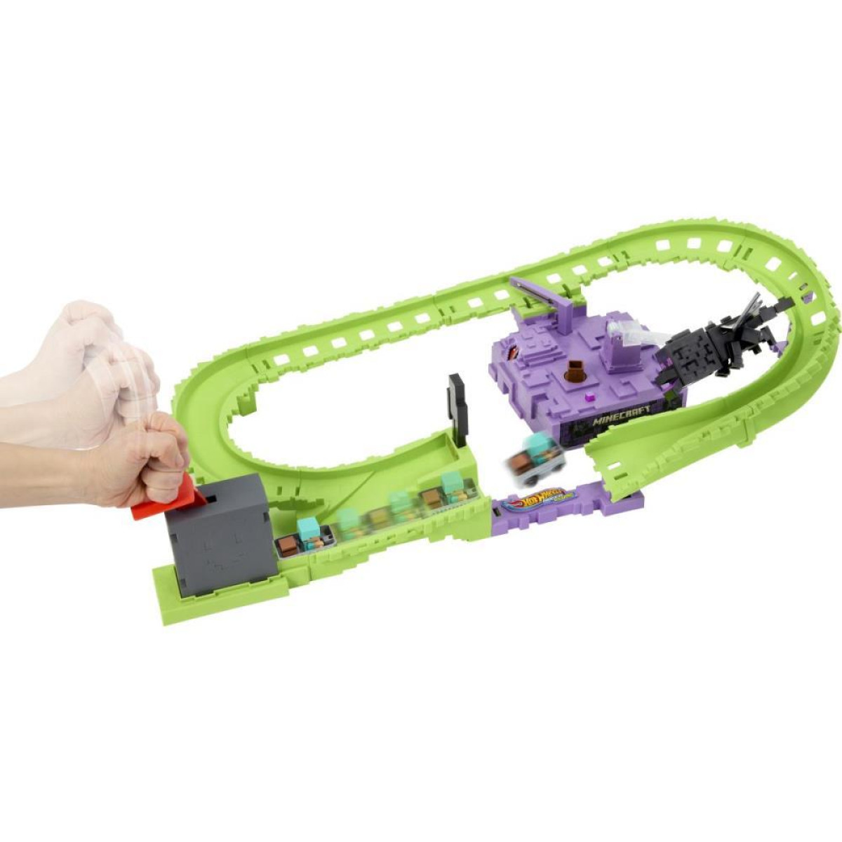 Você pode correr para o O Fim - o nível final e icônico do Minecraft - com um Hot Wheels RacerVerse Steve com Armadura de Diamante e derrotar um temível Dragão Ender giratório! Você pode dar corda no nêmesis e lançar Steve em seu Carrinho de Mina die-cast no momento certo para fazer uma manobra de salto e correr para evitar ser jogado para fora da pista. Cada volta concluída diminui a barra de saúde do inimigo e, quando ele é derrotado após seis voltas, o Dragão Ender vira. As cores e as decorações podem variar.