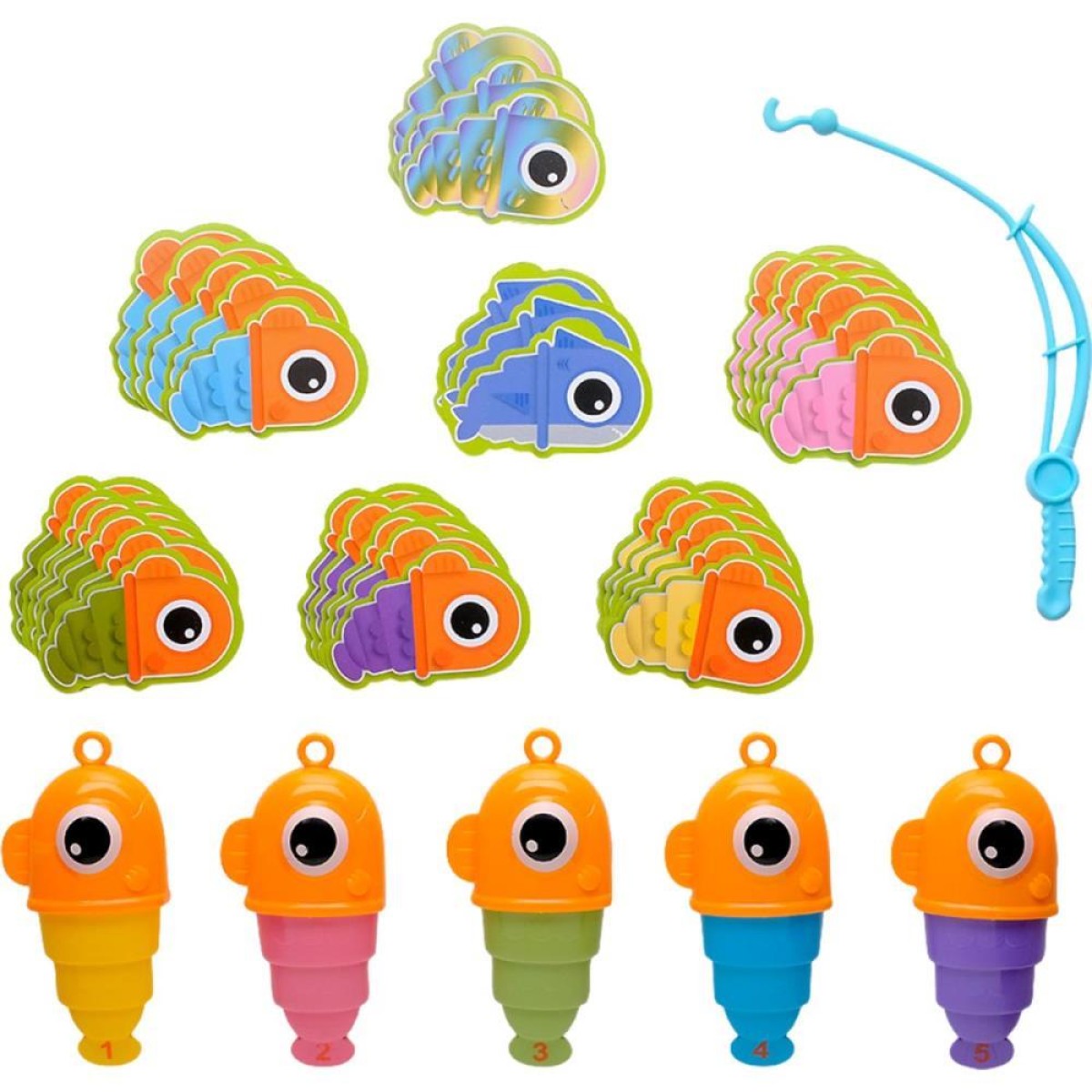 Contem 5 peixes pequenos, 1 vara de pesca, 36 cartoes e 1 manual de instrucoes;