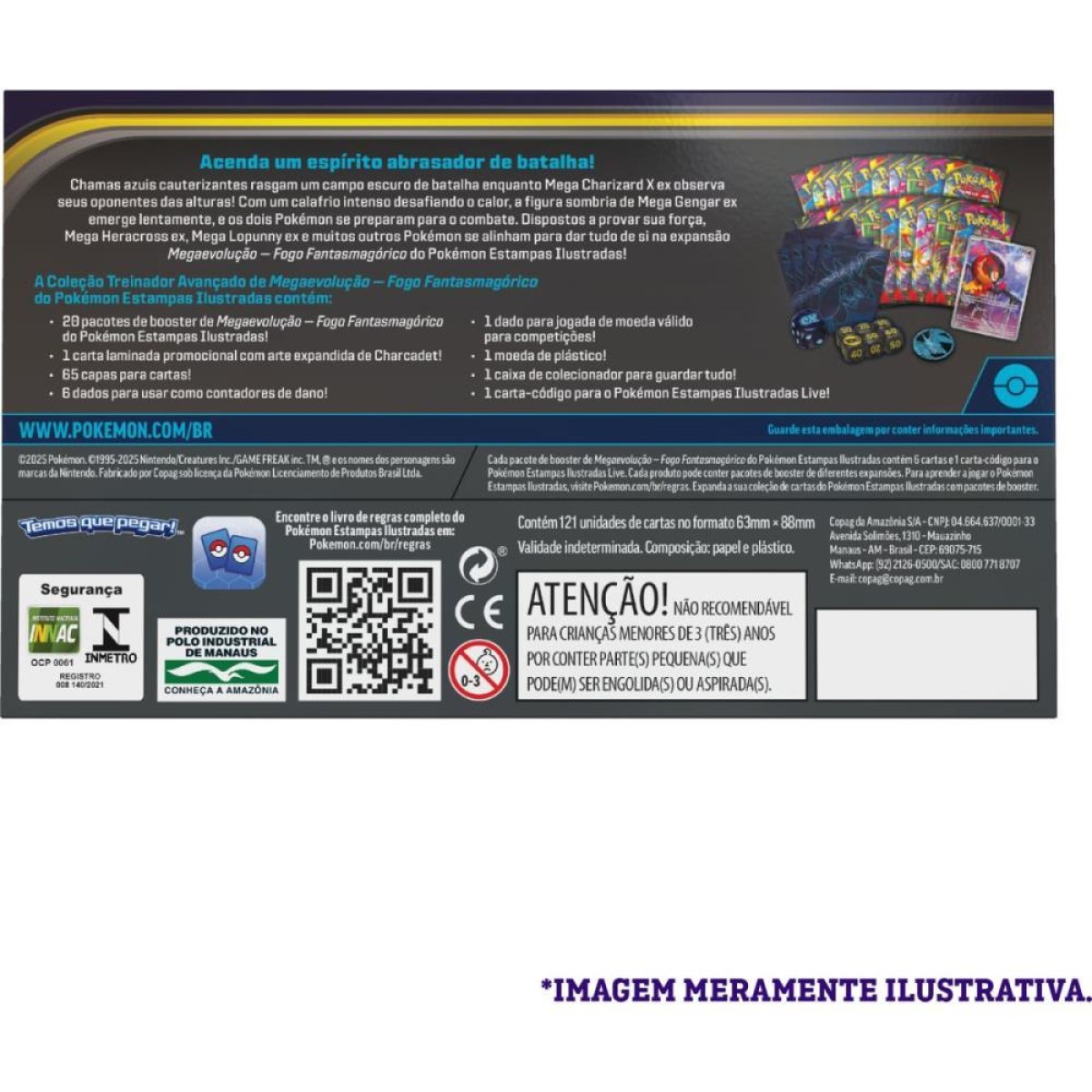 Chamas Azuis cauterizantes rasgam um campo escuro de batalha enquanto Mega Charizard X ex observa seus oponentes das alturas! Com um calafrio intenso desafiando o calor, a figura sombria de Mega Gengar ex emerge lentamente, e os dois Pokemon se preparam para o combate. Dispostos a provar sua forca, Mega Heracross ex, Mega Lopunny ex e muitos outros Pokemon se alinham para dartudo de si na expansao Megaevolucao — Fogo Fantasmagorico do Pokemon Estampas Ilustradas"