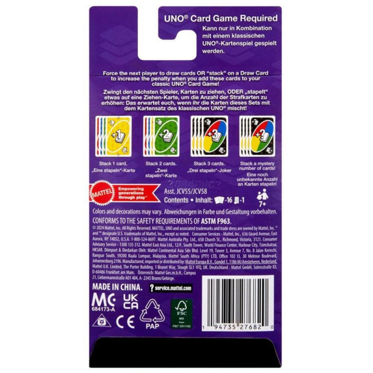 Você pode adicionar qualquer uma das cartas especiais desses pacotes a um baralho clássico de UNO e a diversão começará! Há um pacote em que todas as cartas invertem o jogo, um pacote em que os jogadores empilham penalidades sobre outras penalidades, um pacote em que os jogadores trocam cartas e um pacote em que os jogadores descartam várias cartas em um turno! Os pacotes de cartas são um ótimo presente para os fãs de UNO e amantes de jogos de cartas a partir de 7 anos de idade. Cada pacote é vendido separadamente, sujeito à disponibilidade. As cores e as decorações podem variar.