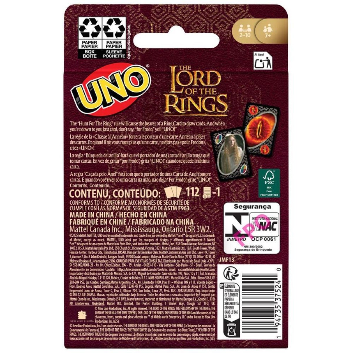 Os fãs dos filmes “O Senhor dos Anéis” vão adorar este UNO temático! Com um deck que apresenta imagens dos personagens favoritos da produção, os jogadores precisam combinar cores e números. E mais: tem uma regra especial, a carta Wild Hunt For The Ring, que pode fazer outros jogadores comprarem cartas se tiverem uma Ring Card na mão. E, quando estiver com a última carta, não se esqueça de gritar “UNO!” É um presente divertido para fãs de “O Senhor dos Anéis” e para quem gosta de jogos de cartas a partir dos 7 anos de idade. Cores e decorações podem variar.