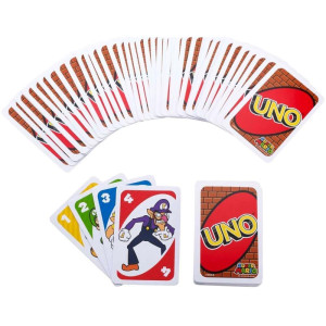 Junte-se a Mario, Luigi e todos os seus amigos para um jogo especial de UNO™! É o clássico UNO™ que você adora, mas esta versão também inclui um Mario Super Star Card especial que torna seu personagem invencível! Depois que outro jogador joga uma carta Draw 2+ ou Wild Draw 4+, você joga a Super Star Card para devolver o poder a esse jogador e fazê-lo comprar duas ou quatro cartas! Ganhe pontos sendo o primeiro a se livrar de todas as cartas da sua mão. Primeiro jogador ou equipe a 500 vitórias. Quando você estiver com apenas uma carta, não se esqueça de gritar UNO!