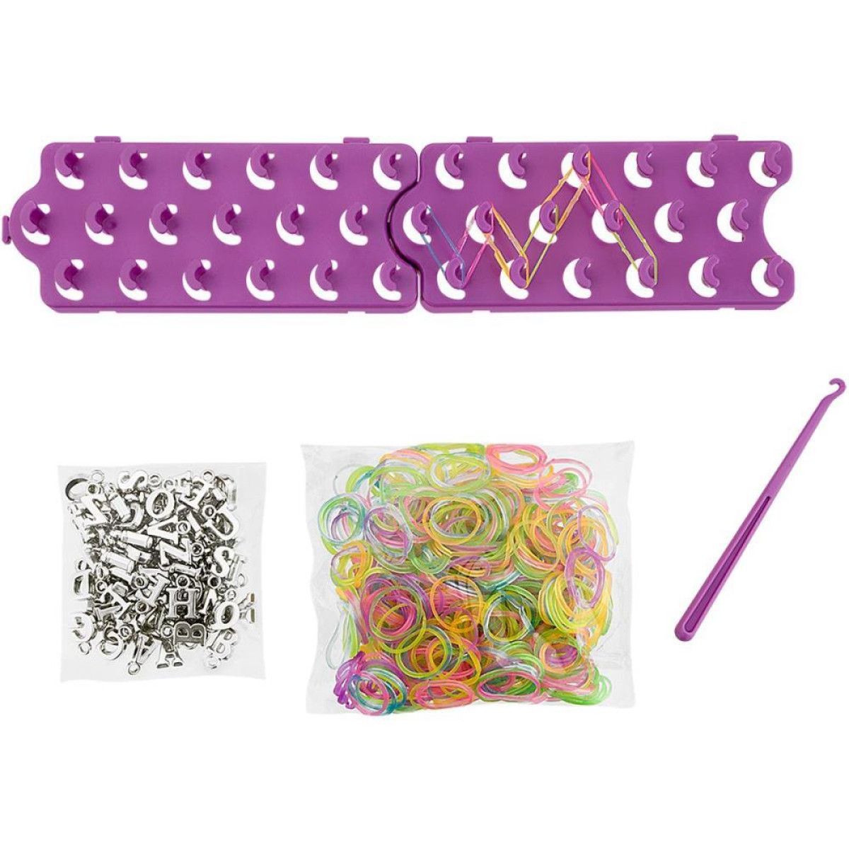 O kit acompanha 1 tear plastico?, 1 gancho, 600 elasticos que brilham no escuro?, 77 pingentes de letras 2 letras de cada letra do alfabeto e mais 5 para cada vogal A,E,I,O,U? e 24 pecas em forma de fecho.