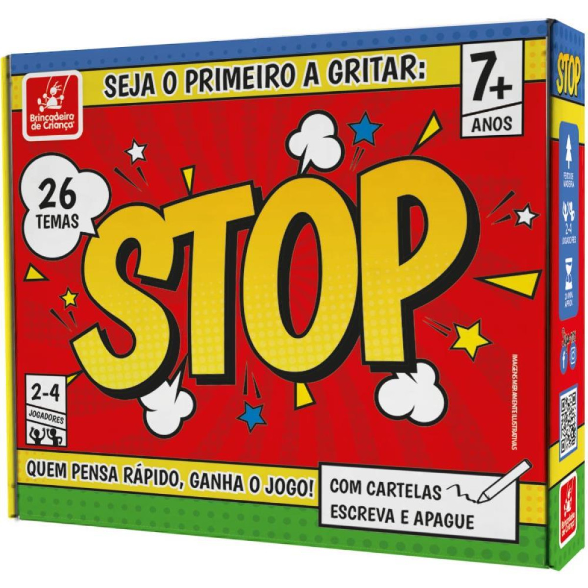 Em "STOP", cada rodada e uma corrida contra o tempo e seus oponentes! Voce precisa pensar rapido, encontrar as respostas certas para cada categoria e ser o primeiro a gritar STOP! para interromper o jogo e garantir sua vantagem. Mas cuidado: respostas repetidas ou erradas podem te fazer perder pontos! Com partidas dinamicas e desafiadoras, "STOP" e perfeito para testar seus conhecimentos, sua agilidade mental e sua criatividade. Um jogo envolvente para todas as idades, ideal para reunir amigos e familia em momentos de pura diversao e competicao.