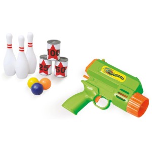 Contem: 1 lanador, 3 bolinhas, 3 latinhas e 3 pinos, e voce pode derrubar os pinos, latinhas ou acertar outros alvos, tomando muito cuidado, claro!