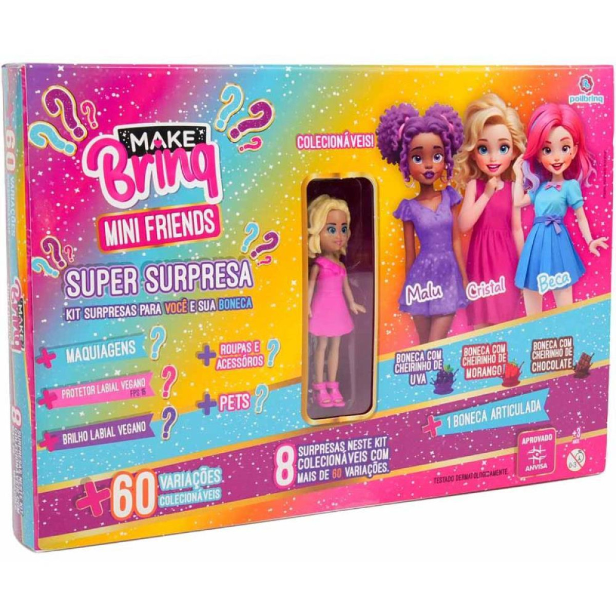 A Super Surpresa chegou para transformar o universo das suas brincadeiras! Este incrivel kit de surpresa traz uma experiencia unica e cheia de encantos. Com 60 variacoes colecionaveis de bonecas articuladas, cada uma com um cheirinho especial, voce vai se apaixonar a cada descoberta. Alem das adoraveis bonequinhas, o kit tambem acompanha um protetor labial vegano, gloss labial vegano, esmalte e ate bichinhos fofissimos, tornando cada momento ainda mais divertido e completo.