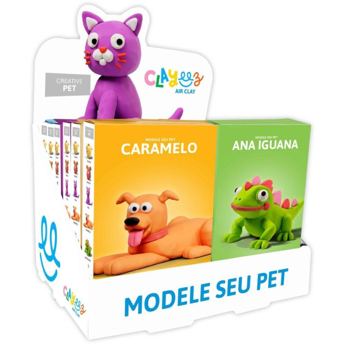 Desperte a criatividade das criancas com o Clayeez Creative! Este kit de massinha air clay, permite que os pequenos modelem 6 adoraveis pets, cada um com nome e personalidade unicos. O conjunto inclui 3 potes de massinha colorida correspondentes a cada pet e um sache de massinha preta para detalhes como os olhinhos. Acompanha um tutorial passo a passo que ensina, de forma divertida e educativa, como dar vida a cada personagem. Com o Clayeez Creative, a imaginacao ganha forma e a diversao e garantida!