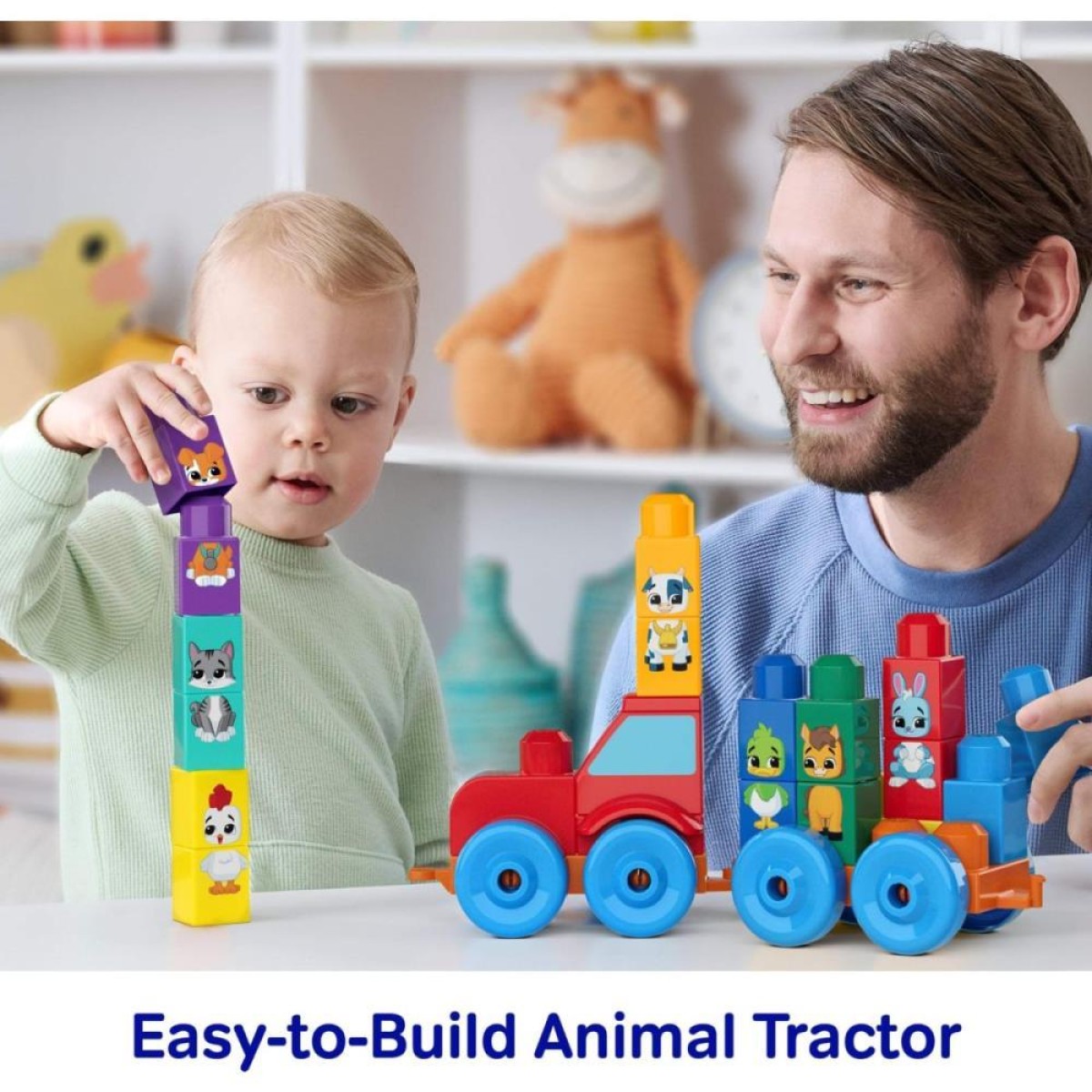 Apresente aos seus pequenos o trator com temática de animais MEGA BLOKS Build & Match Animal Tractor, um brinquedo de construção com 30 peças. O kit inclui 2 bases com rodinhas e blocos grandes para empilhar e combinar, com 8 animais da fazenda, enquanto aprendem as cores. As crianças podem soltar a imaginação para criar novos animais, misturando os blocos. É compatível com outros kits MEGA BLOKS para aumentar a diversão!