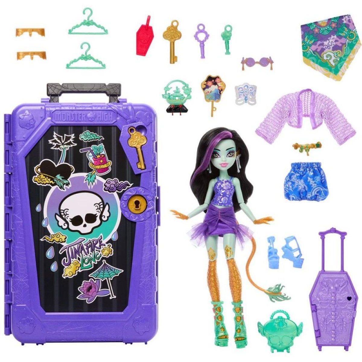 Inclui: 1 boneca Monster High, 1 mala, 3 chaves, 2 malas menores, roupas e acessórios variados. A boneca não fica em pé sozinha. Cores e decorações podem variar.
