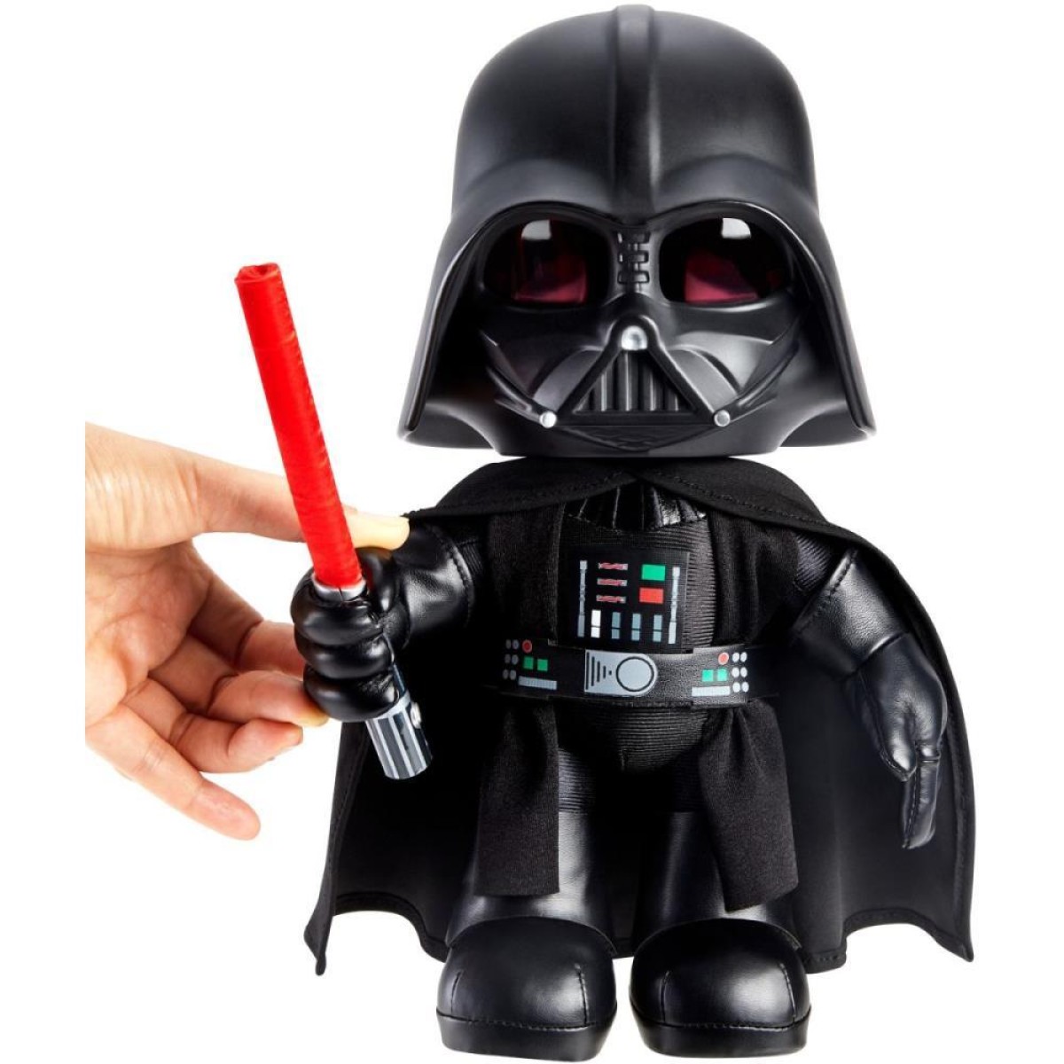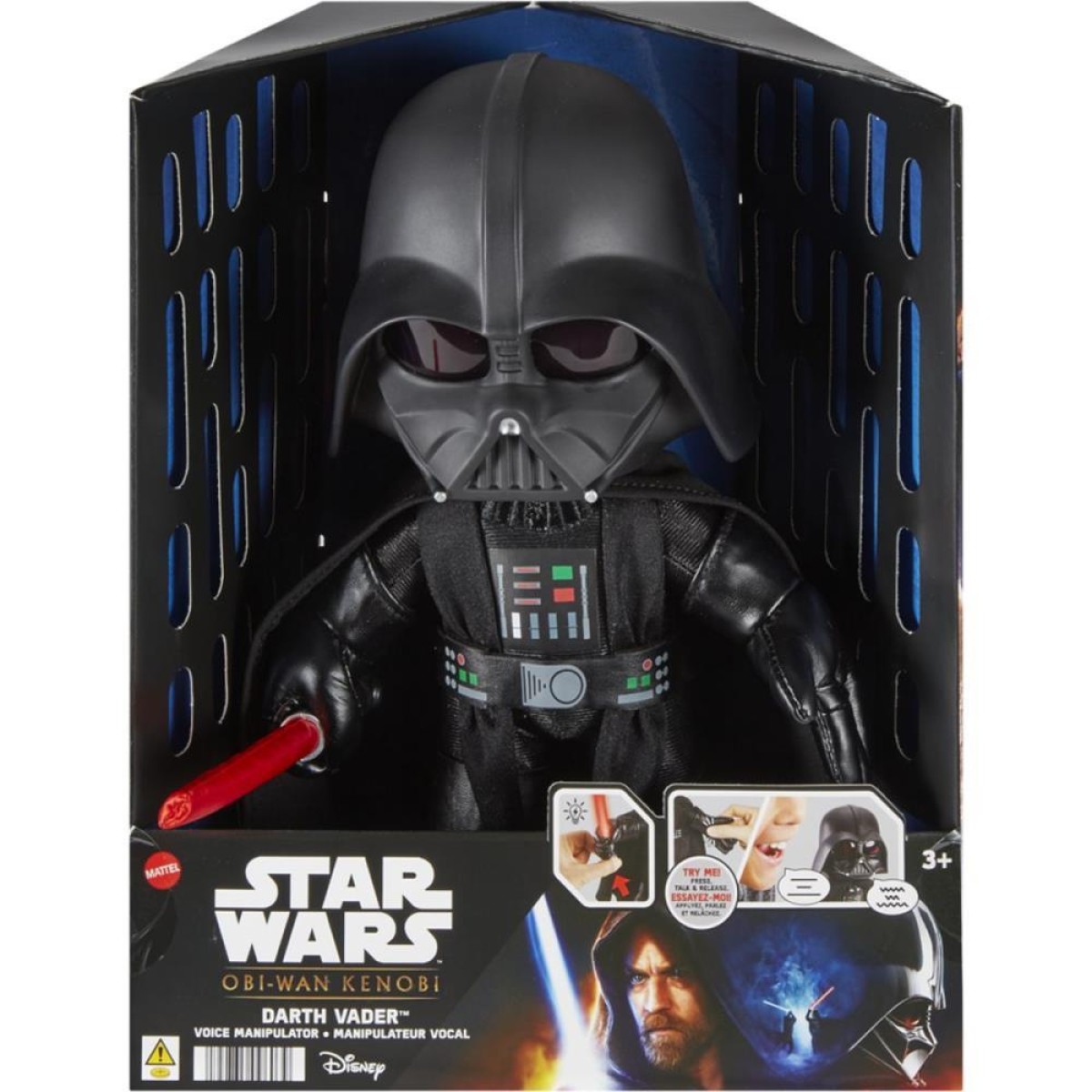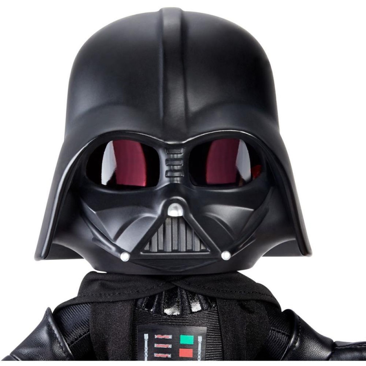 Os fãs de Star Wars podem liberar seu lado sombrio com a figura de pelúcia do Manipulador de Voz Darth Vader com trocador de voz e sabre de luz iluminado para celebrar a aparição do Lorde Sith na série Obi-Wan Kenobi no Disney+. Pressione a mão do boneco macio para ligar seu sabre de luz vermelho e ativar o trocador de voz. Quando chegar a hora de dar ordens às tropas imperiais, o mecanismo manipulador de voz transformará qualquer voz em um comando no estilo Vader. Com 11 polegadas de altura, esta versão super macia do vilão mais temível da galáxia tem um visual icônico projetado com tecido de alta qualidade e um capacete de plástico detalhado para uma aparência verdadeiramente autêntica. A pelúcia Darth Vader é um ótimo presente para fãs e
