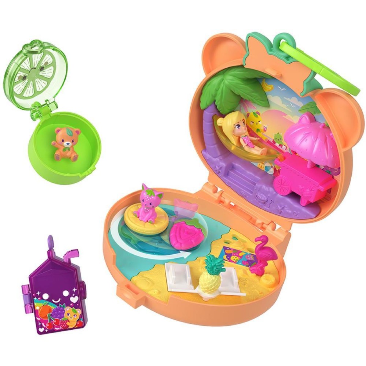Os kits compactos da Polly Pocket ganharam uma nova versão com pelúcia! O fofo Plushie Bear Compact vem com um compacto clássico da Polly, dentro de um ursinho de pelúcia removível. O kit inclui uma micro boneca, um chaveiro, três pets e um acessório de fruta. Dois pingentes temáticos se abrem para guardar a boneca, os bichinhos e os acessórios! Dentro do compacto, existe um doce paraíso com rede de balanço, roda giratória com boias de fruta e muito mais! A pelúcia pode ser usada sobre o compacto ou separadamente. Depois, é só prender e levar o compacto para brincar onde quiser! Ideal para crianças a partir dos 4 anos de idade, especialmente aquelas que amam os compactos clássicos da Polly. Sujeito à disponibilidade. Cores e decorações podem variar.