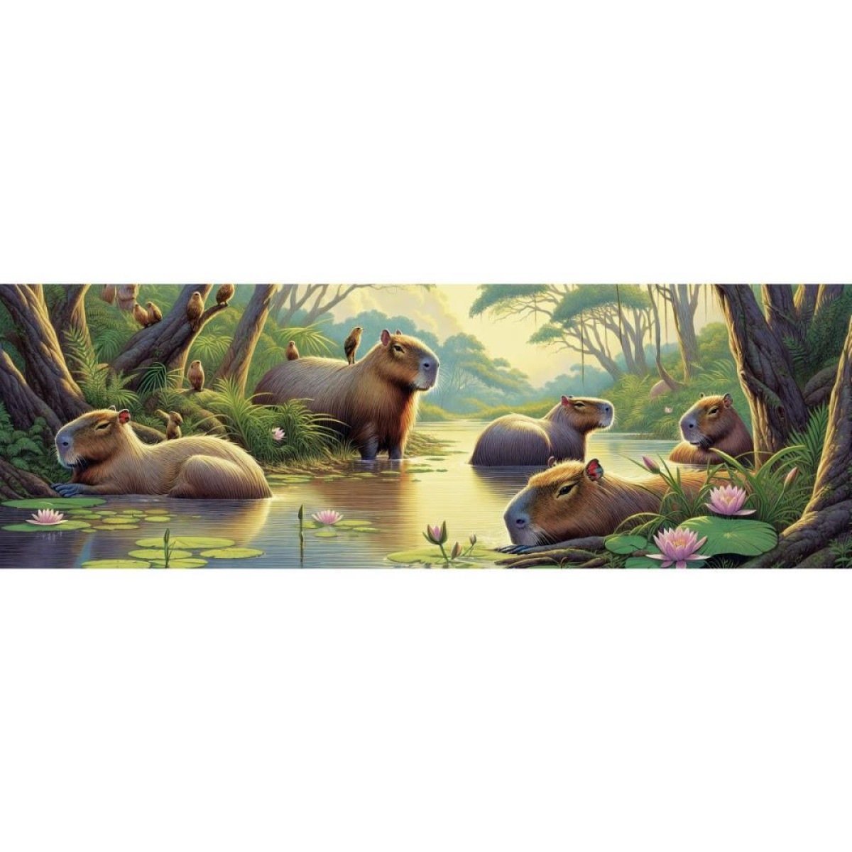 Neste simpatico e fofo quebra-cabeca, capivaras serenes vivem tranquilamente em seu habitat natural, uma exuberante floresta tropical com um rio tranquilo para relaxarem ao lado de lirios d’agua.