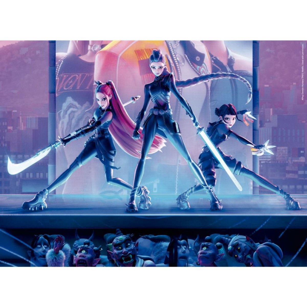 O quebra-cabeca de 500 pecas destaca as protagonistas do grupo HUNTRX em uma cena de acao intensa e cinematografica. Rumi, Mira e Zoey aparecem em pleno combate, em um cenario noturno iluminado por tons neon. A composicao vibrante, com poses acrobaticas e expressivas, reforca o espirito de uniao, poder e protagonismo do trio.