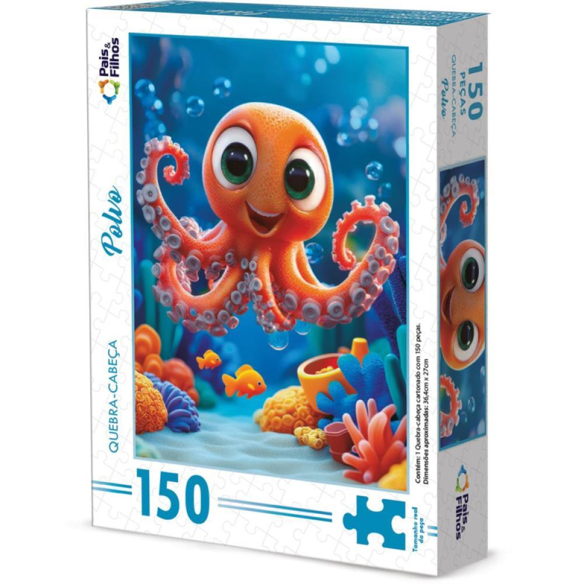 Com 150 pecas, este quebra-cabeca traz um polvo superfofo em seu habitat no fundo do mar. A imagem cativa a primeira vista e transforma o momento de montar em uma experiencia leve e envolvente.