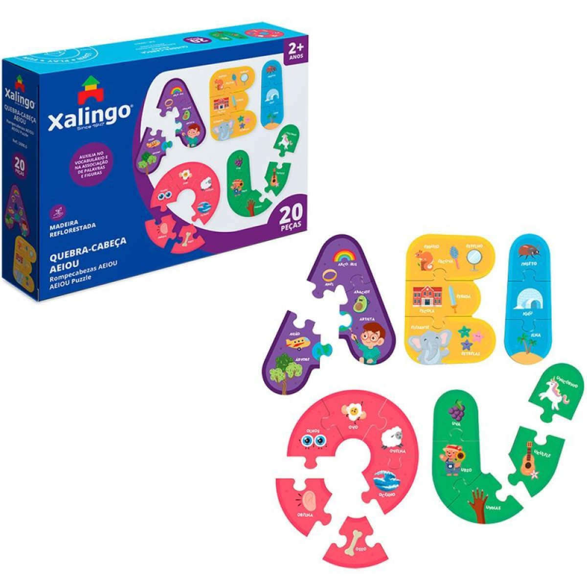 O jogo de quebra-cabeca AEIOU com 20 pecas em madeira reflorestada desenvolve a atencao, a discriminacao visual, o pensamento logico e a relacao partetodo, bem como facilita a exploracao de temas variados. Alem de educativo, auxilia no aprendizado das letras, suas formas e vocabulario. Indicado para criancas a partir dos 2 anos de idade.