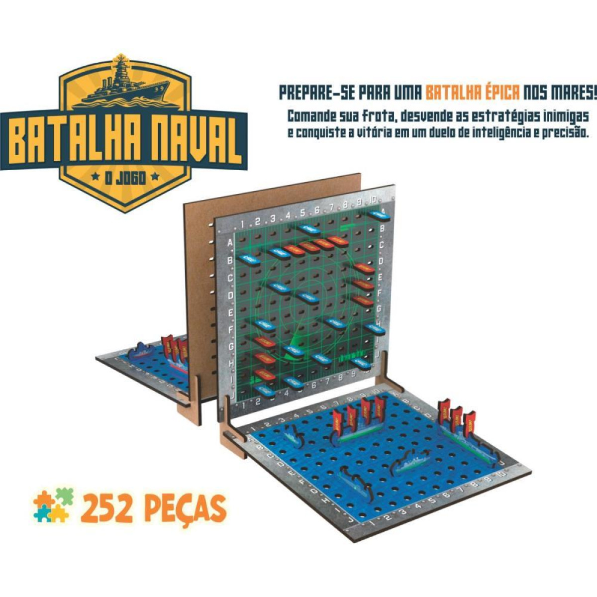 Batalha Naval e uma emocionante disputa de estrategia em alto-mar, onde logica e precisao fazem toda a diferenca! Com 252 pecas em madeira, o desafio e claro: descubra e afunde a frota inimiga antes que afundem a sua! Indicado para criancas a partir de 7 anos, o jogo estimula raciocinio logico, estrategia e concentracao. Prepare-se, capitao… a batalha vai comecar!