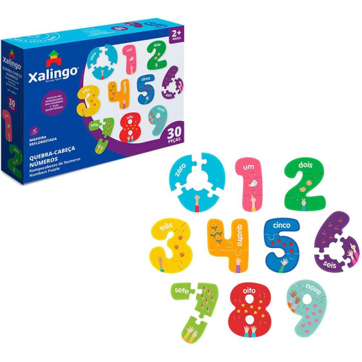 O jogo de quebra-cabeca Numeros com 30 pecas desenvolve a atencao, a discriminacao visual, o pensamento logico e a relacao partetodo, bem como facilita a exploracao de temas variados. Alem de educativo, o quebra-cabeca numeros auxilia o aprendizado dos numeros de 0 a 10 e tambem na associacao de numeros e quantidades. Indicado para criancas a partir dos 2 anos de idade.