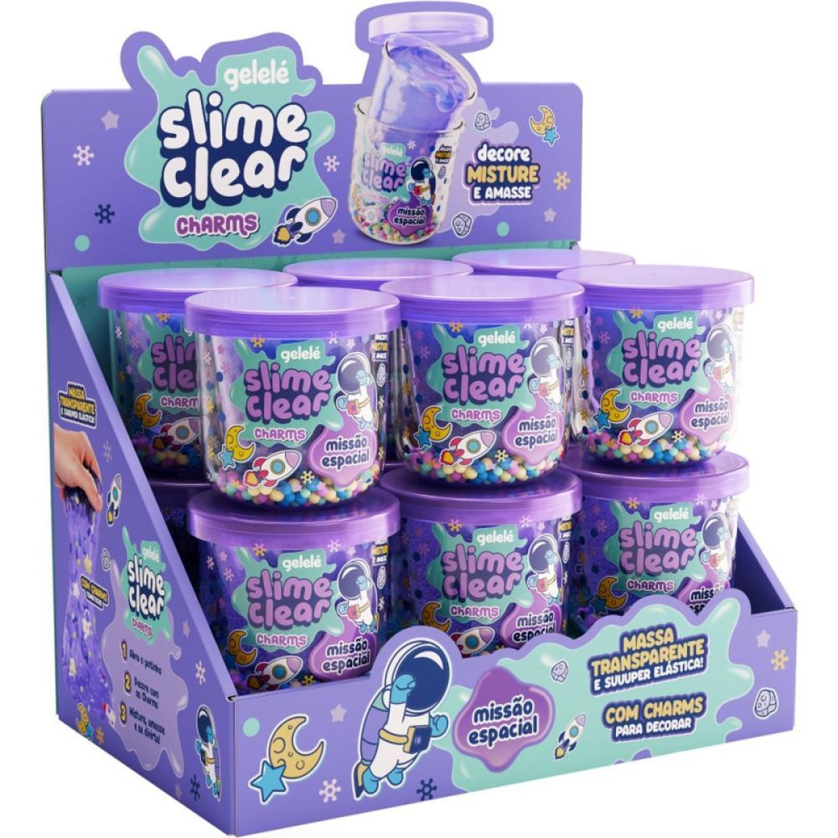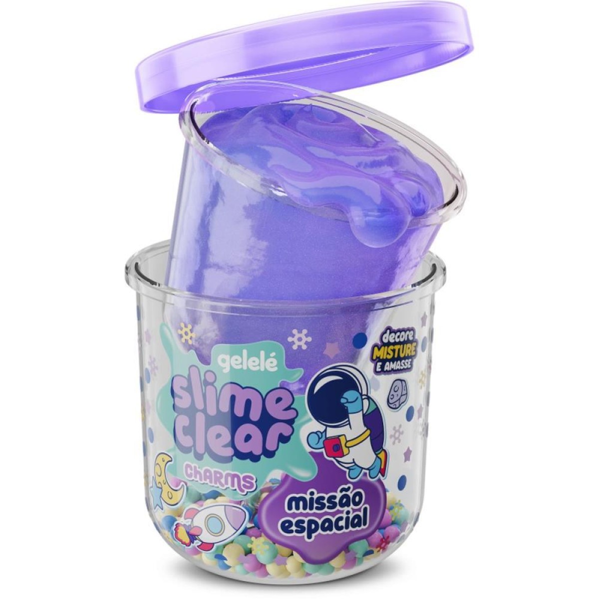 Slime Clear e uma nova textura de slime transparente. A linha Charms leva a brincadeira para o espaco, com enfeites estelares para decorar, misturar e amassar, criando um slime crunchy super divertido.