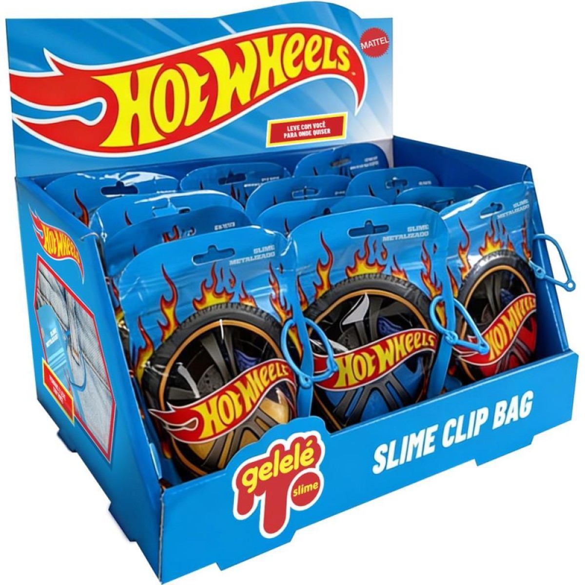 Leve a diversao para todo lugar! Vem em uma embalagem em formato de roda Hot Wheels com clip personalizado para pendurar e fechamento para guardar a slime.