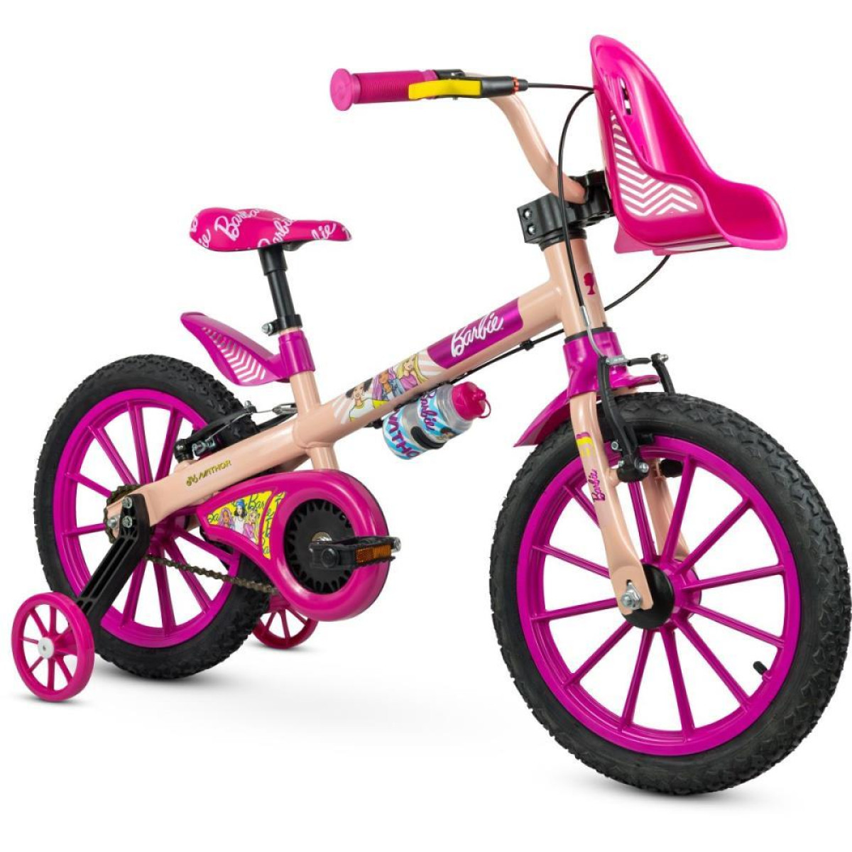 As bicicletas aro 16” Nathor possui modelos com aro em ABS e em aluminio. O limitador de giro evita que o guidao vire completamente, proporcionando mais seguranca e preservando o freio. Para facilitar o aprendizado e a identificacao do freio traseiro, a macaneta amarela ganha destaque e indica o acionamento ideal na hora da frenagem. As rodinhas laterais permitem o desenvolvimento da crianca na fase de aprendizado, estimulando o equilibrio e a autonomia.