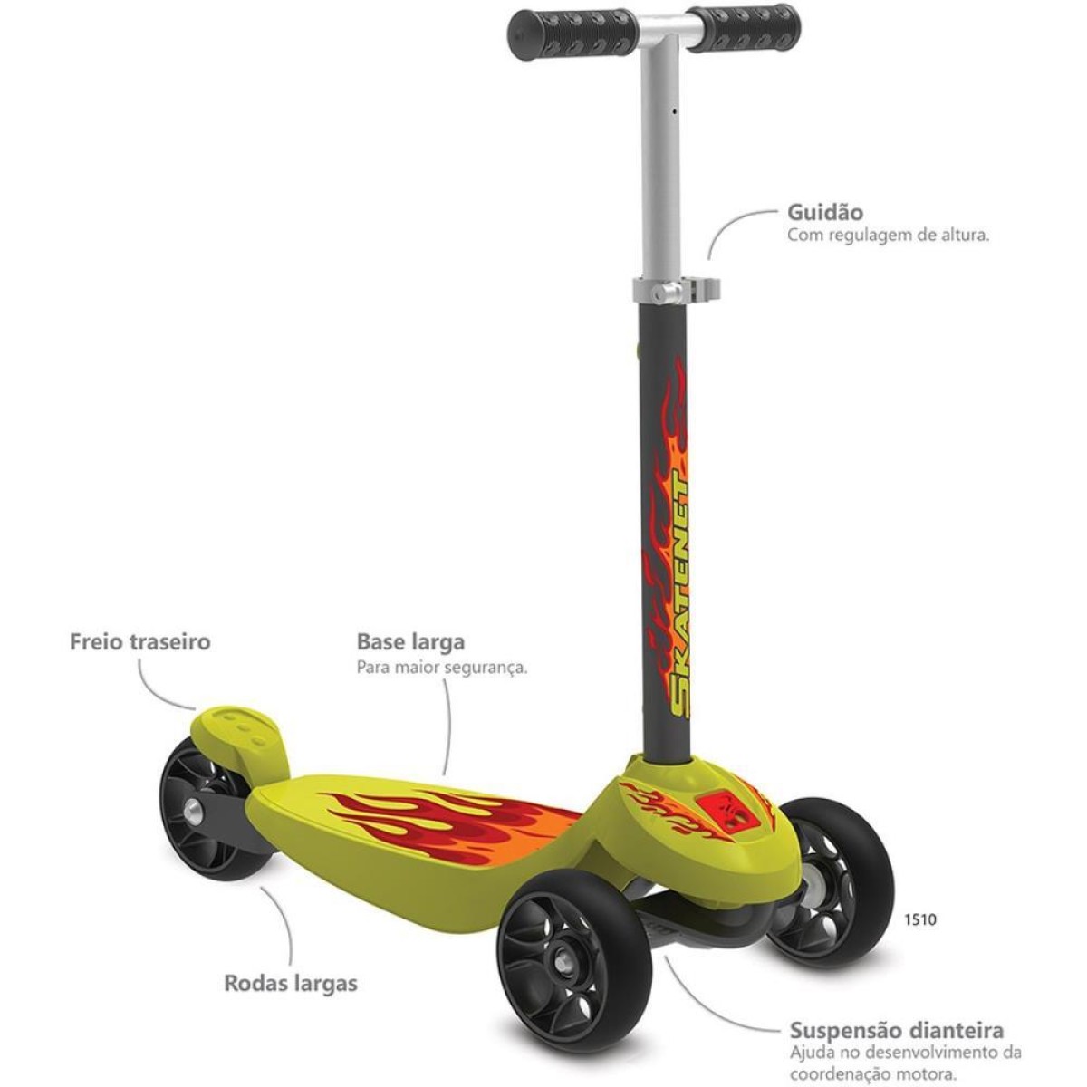 Desenvolve o equilibrio, o senso de direcao e coordenacao motora. Com o guidao fixo o Skatenet vira para a esquerda ou para a direita com a inclinacao do corpo. Guidao com regulagem de altura. Manoplas em TPE atoxico. Freio traseiro. Rodas largas. Base mais larga indicada para iniciantes, com espaco para a crianca apoiar os dois pes com seguranca. Peso maximo suportado: ate 80kg. Idade recomendada: acima de 2 anos.