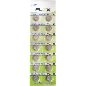 Bateria Botão 1,5v LR1130 Flex, cartela com 14 Un. Compatível com: Calculadoras; Agendas eletrônicas; Placas mãe de computadores; Controles remotos; Chaves de carros; Entre outros. Especificações:Voltagem: 1,5v; Alcalina; Amperagem: 70 mAh.