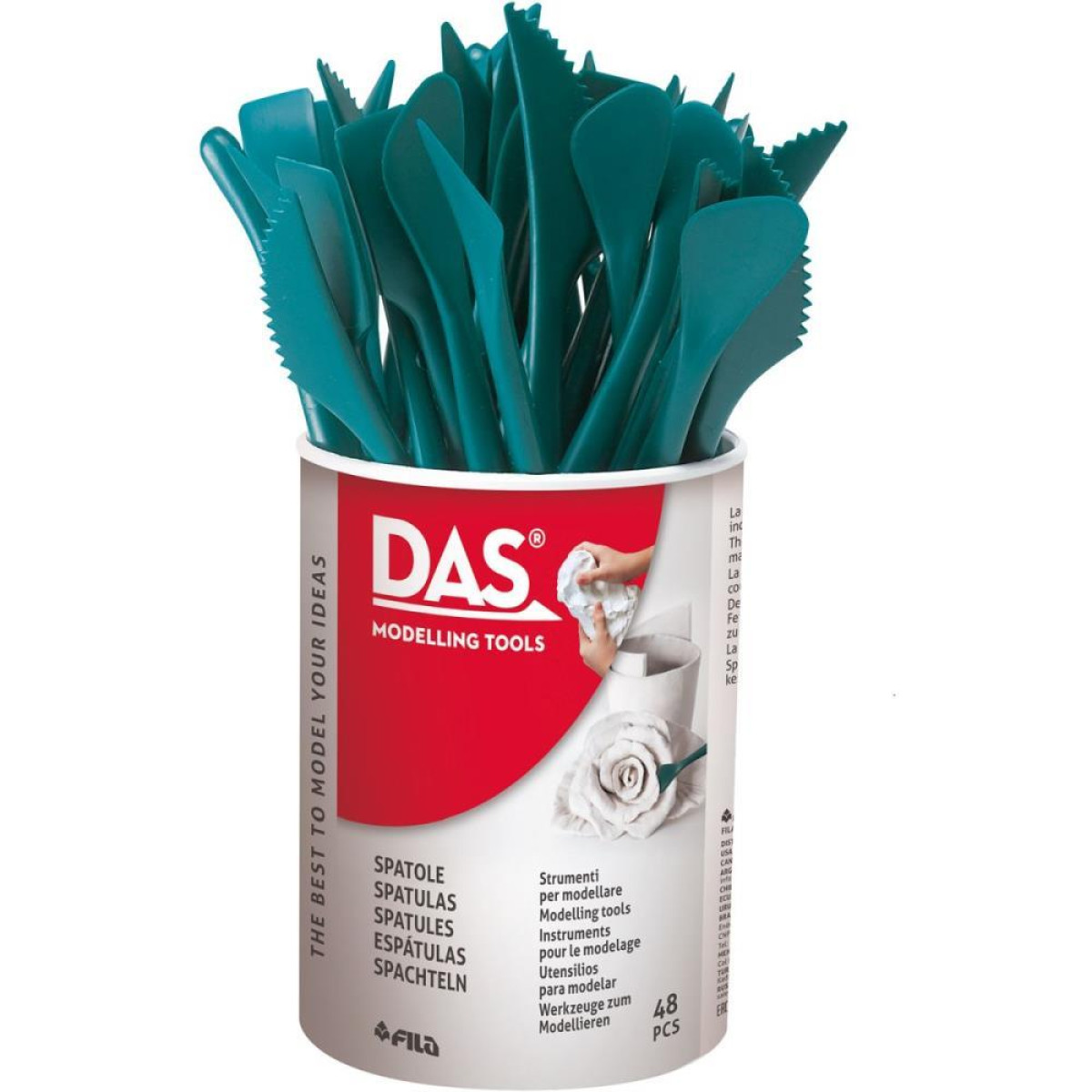Pote com espatulas e ferramentas de modelagem. O pote de ferramentas para esculpir contem 48 pecas, com 12 unidades de cada tipo. As ferramentas para esculpir sao ideais para modelar detalhes, cavar e remover o excesso de massa DAS com precisao. Ja as espatulas de corte sao perfeitas para acabamentos, marcacoes, texturizacoes e cortes no material, oferecendo mais controle e qualidade ao trabalho