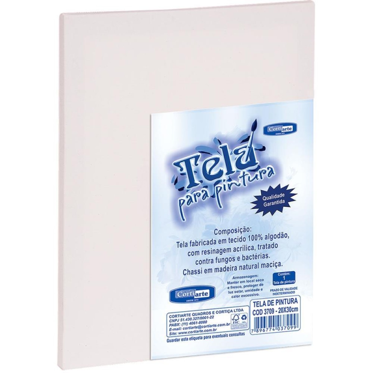 Tela para pintura fabricada com tecido em fibra de algodao cru, revestido com resinagem acrilica e tratado contra fungos e bacterias. Chassi em madeira 2,2 CM de largura e 1 CM de espessura, Certificado FSC proveniente de reflorestamento.