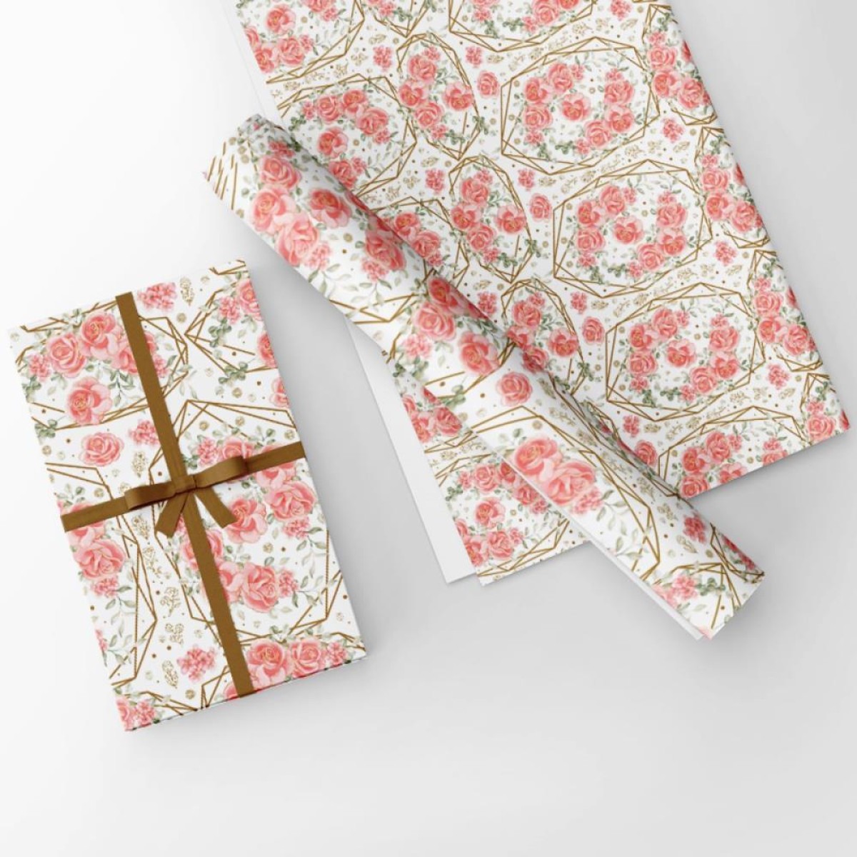 Papel Presente Bobina Couche 60cm. Mod.206 Rosas Ouro Hexag Eleve a arte de presentear com nosso Papel de Presente. Seus clientes vao adorar e seus presentes nunca mais serao os mesmos. Papel couche com brilho.