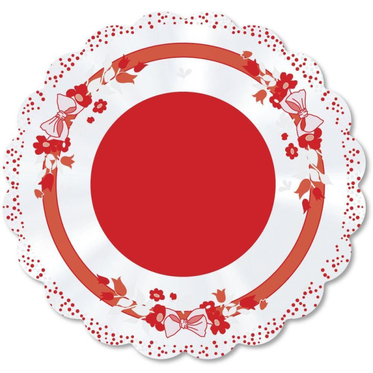 Poli Redondo 38cm Laco Vermelho Poli em formato redondo, bordas onduladas, decorado. Ideal para arranjos e vasos de flores, fundos de cestas e doces, festas e decoracoes em geral.