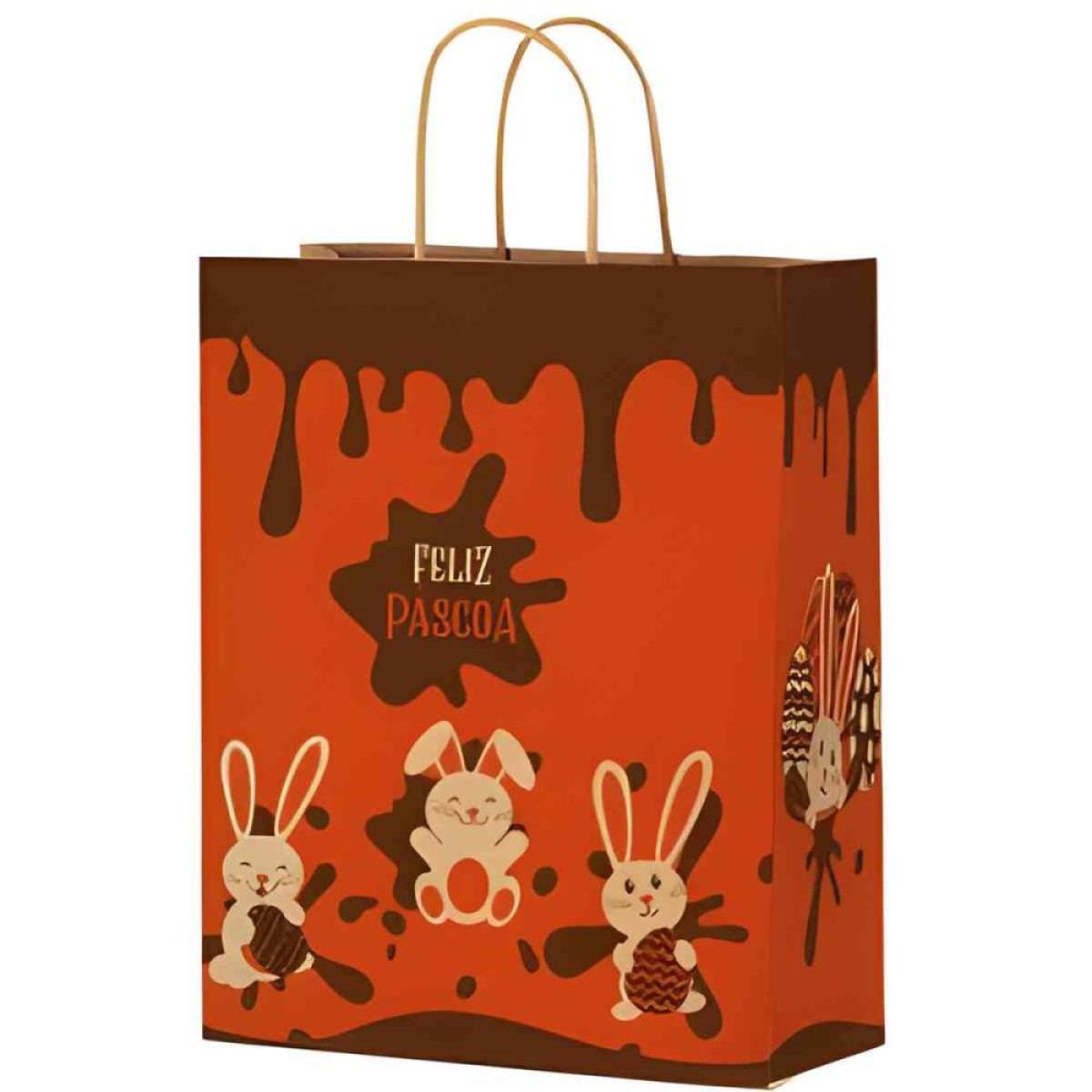 Seu design valoriza ovos de Pascoa, chocolates e kits presenteaveis, oferecendo praticidade no transporte e um visual encantador para o consumidor final. E uma sacola que transforma a entrega em parte da experiencia do presente.