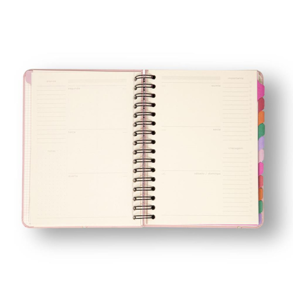 Este planner tem capa dura, cantos arredondados, elastico para fechamento e encadernacao em wire-o espiral duplo. Sao 100 folhas em Papel Polen®Natural 80gm.