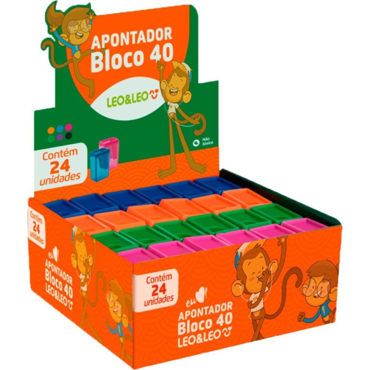 Apontador Com Deposito Leo E Leo Bloco 4cm Rosa/roxo Apontador bloco 4cm com deposito retangular. Caixa com 24 apontadores apenas nas cores rosa e roxo.