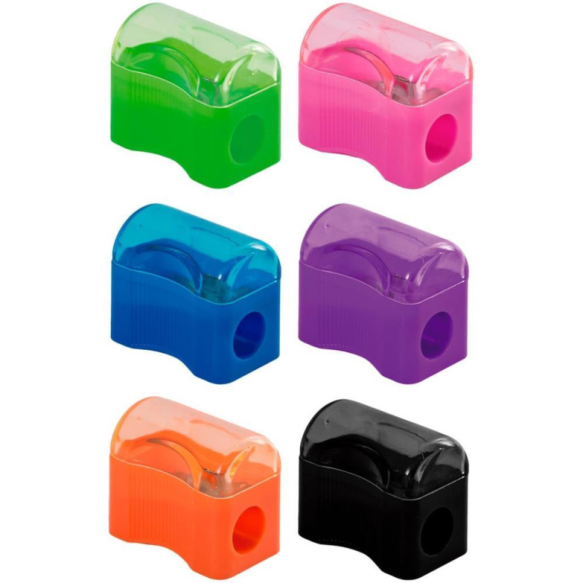 Apontador Com Deposito Mini Cores (s) Com deposito; Formato retangular; Aponta lapis comum; 6 cores vibrantes; Com grip na lateral; Atoxico.