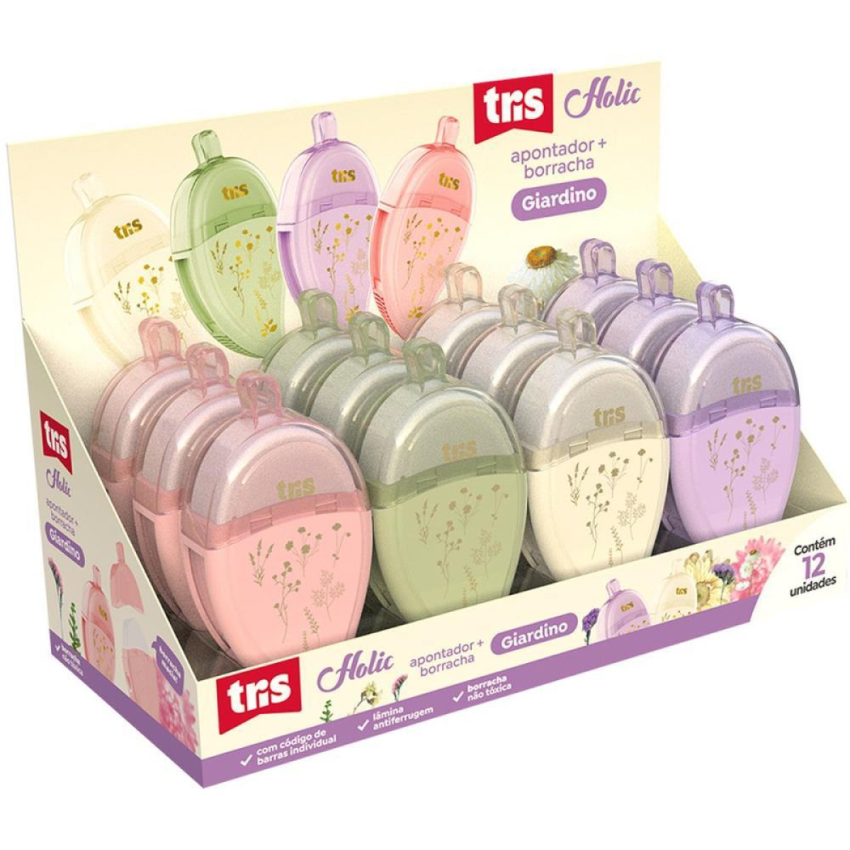 Apontador Com Deposito Tris Giardinho C/borracha 4cores Apontador Com Deposito + Borracha Giardino Holic Delicata - Cores Sortidas - Display C12 un - Tris