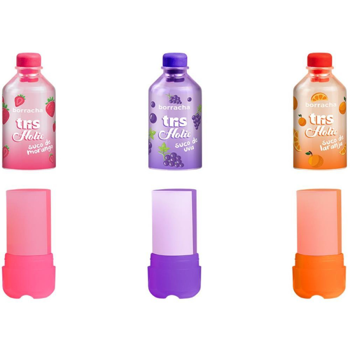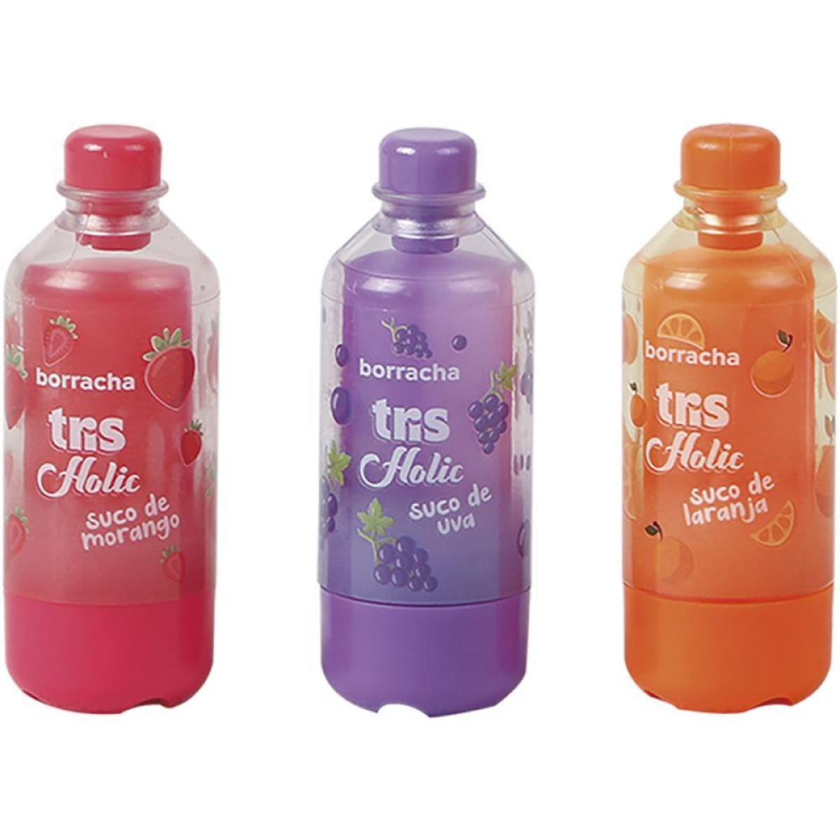 Uma colecao deliciosa! A Lanchinhos traz para o universo de papelaria todas as gostosuras que amamos! A borracha Suquinho tem formato divertido de garrafinhas de suco, nos "sabores" de uva, morango e laranja! Borracha com textura macia e capa protetora!