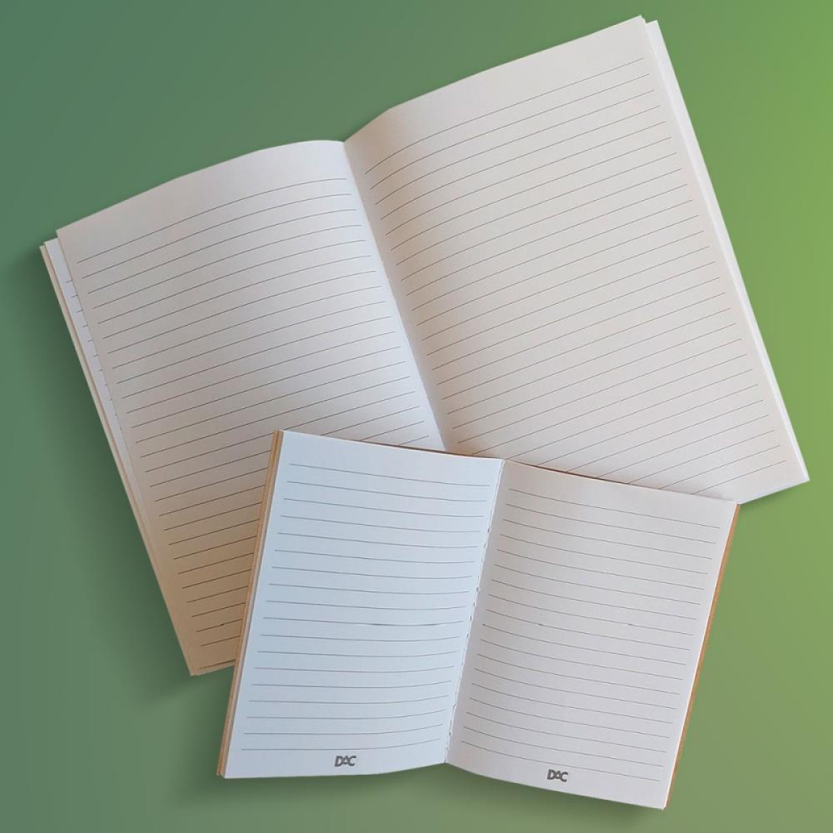 Cada caderno de anotacoes possui 32 folhas pautadas feitas de papel reciclado, ideal para presentear quem ama papelaria sustentavel e elegante.
