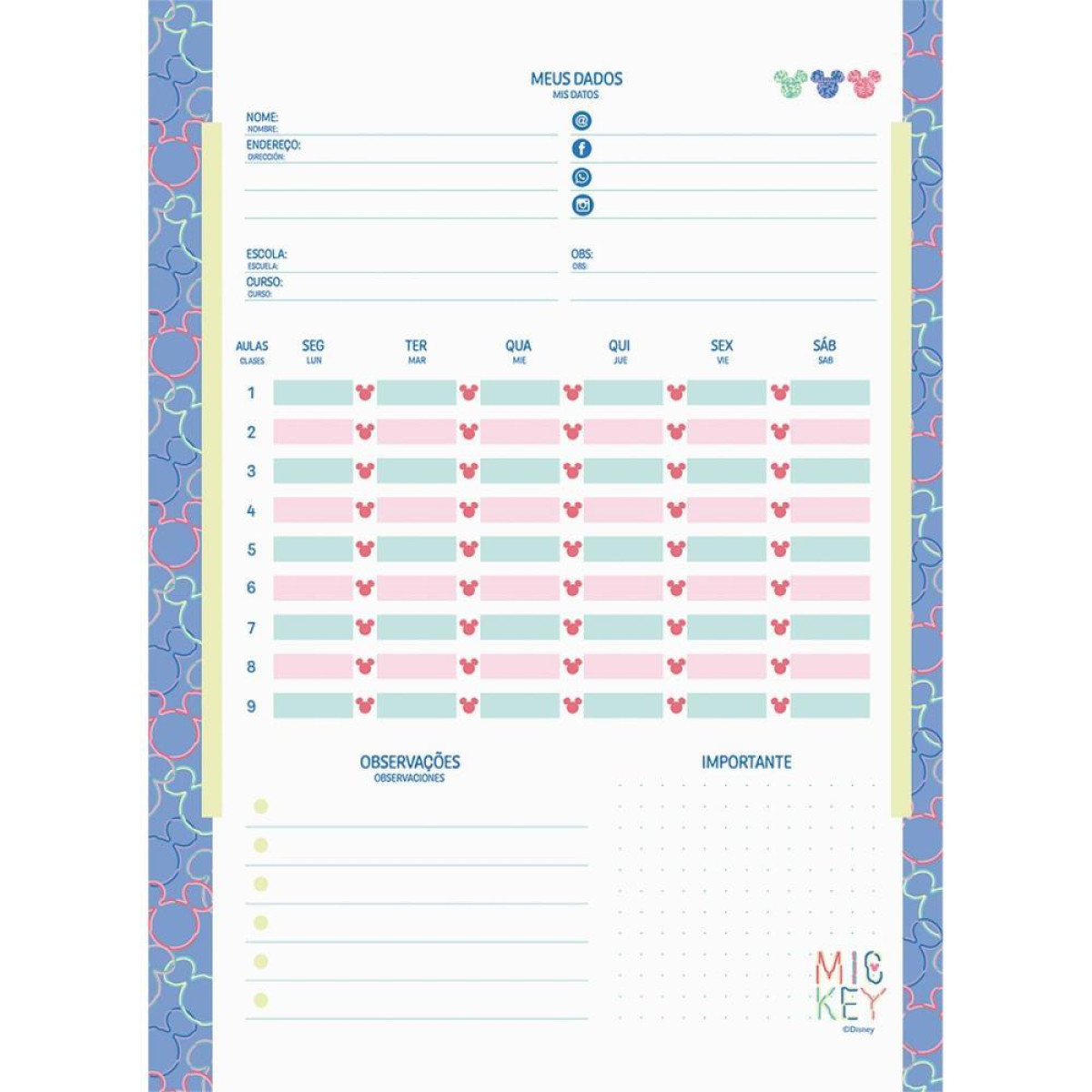 O Caderno Neo Universitario Mickey e um lancamento que une nostalgia e modernidade com muito estilo. A capa vibrante com o iconico formato da cabeca do Mickey em hot stamping dourado garante um visual alegre e sofisticado. O acabamento em laminacao fosca e o fechamento com elastico trazem praticidade e protecao. Com folhas reposicionaveis, divisorias tematicas, adesivos, folha de planejamento e pauta inteligente JandaIA, ele e ideal para organizar os estudos com criatividade. Produto perfeito para fas da Disney que nao abrem mao de funcionalidade com um toque de diversao.