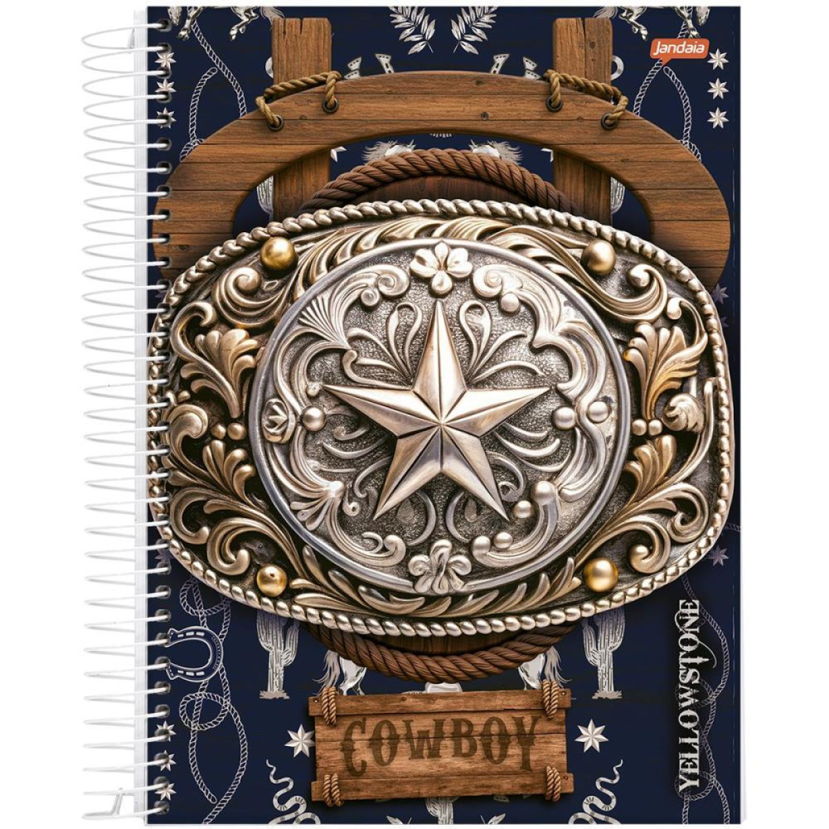 Inspirada na forca e tradicao do Velho Oeste, a linha Yellowstone traz a essencia do lifestyle cowboy em capas impactantes e cheias de atitude. Texturas rusticas, cintos, cavalos e frases marcantes compoem uma colecao que celebra o espirito livre e destemido. Com quatro capas impactantes, que trazem cowboys, selas, chapeus e elementos tipicos em cenarios marcantes, os modelos combinam visual forte com acabamento em laminacao fosca e verniz reserva, garantindo sofisticacao e destaque. O caderno possui Pauta Inteligente JandaIA e acompanha acessorios funcionais como guarda decorado, cartela de adesivo e folhas de planejamento. Perfeito para quem quer levar atitude e identidade para a rotina escolar ou profissional.