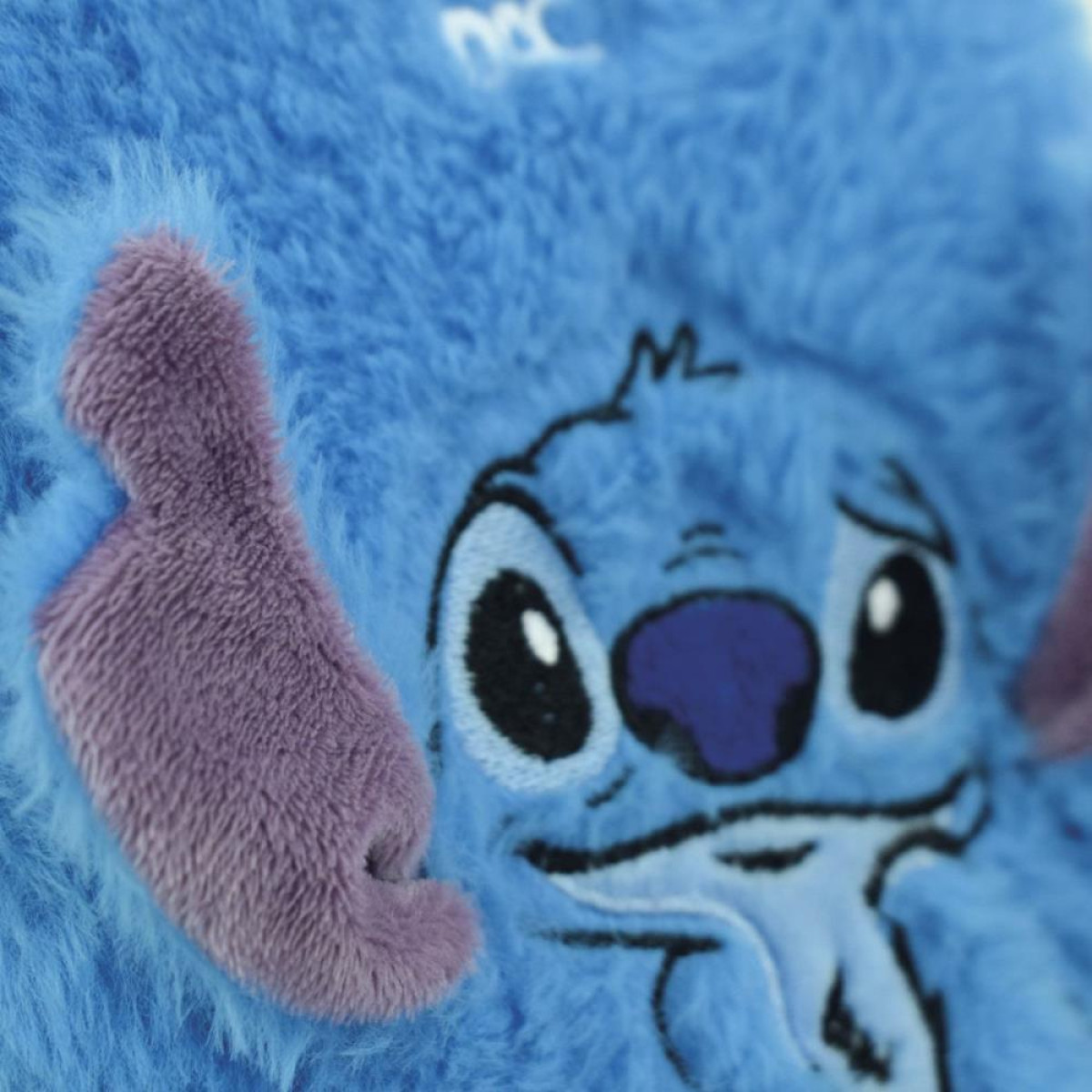 O Caderno A5 Stitch de pelucia DAC, tem textura super macia, 80 folhas decoradas e pautadas, alem de orelhinhas 3D.