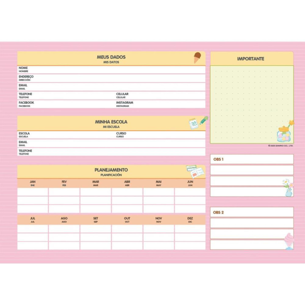 Hello Kitty, My Melody, Kuromi e seus adoraveis companheiros estrelam uma linha repleta de diversidade, charme e afeto. Com acabamento em laminacao brilho, une beleza e funcionalidade em um so produto — perfeito para quem deseja um caderno cheio de estilo e personalidade. Disponivel em 2 modelos de capa sortidos.