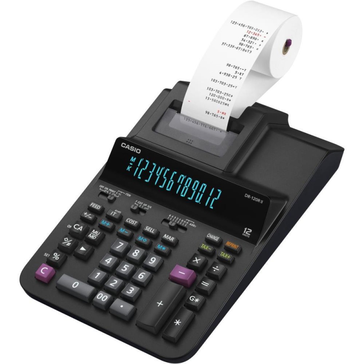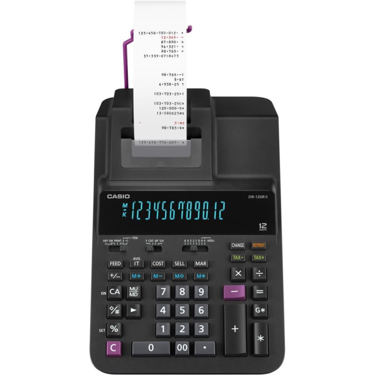 A Casio DR-120RII e uma calculadora de impressao de mesa de 12 digitos e uso intenso, conhecida por suas funcoes robustas para negocios e contabilidade, incluindo impressao em duas cores a uma velocidade de 3,5 linhas por segundo.