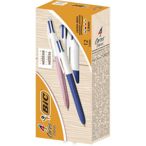 BIC, Caneta Escrita Media Retratil, 4 Cores Classicas, Corpo com Efeito Madeira, 12 Unidades