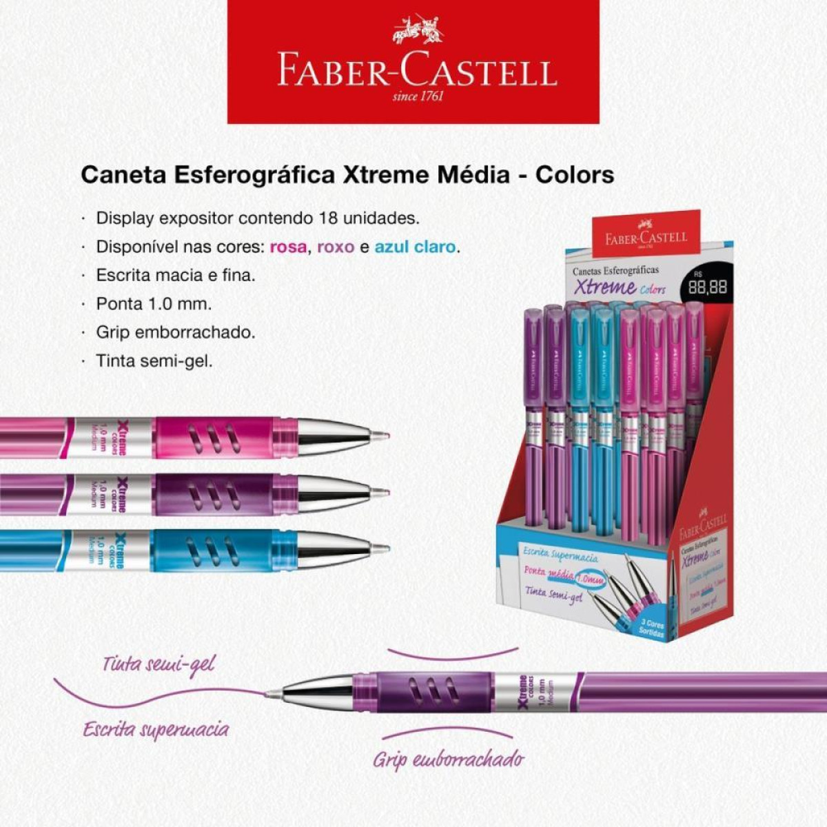 Caneta Esferografica Xtreme 1.0mm Rosa/roxo/az.clar "› Display expositor contendo 18 unidades › Tinta semi-gel nas cores: rosa, roxo e azul claro. › Ponta media: 1,0mm. › Escrita super macia. › Gripe Emborrachado."