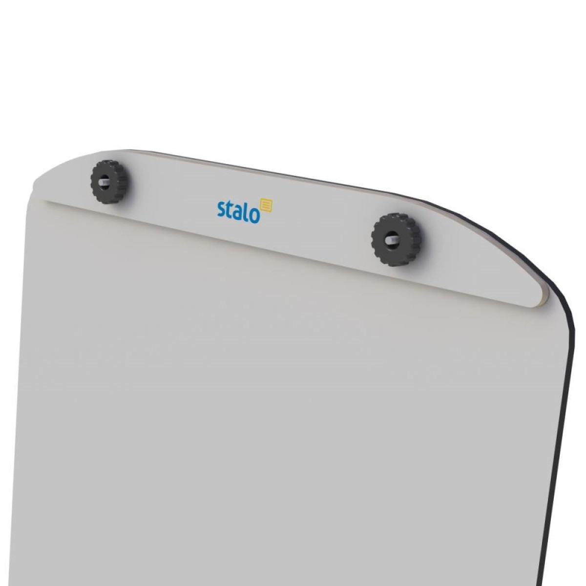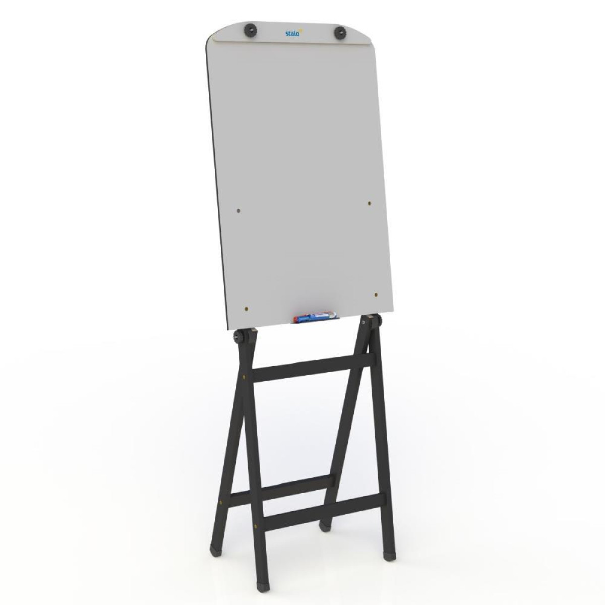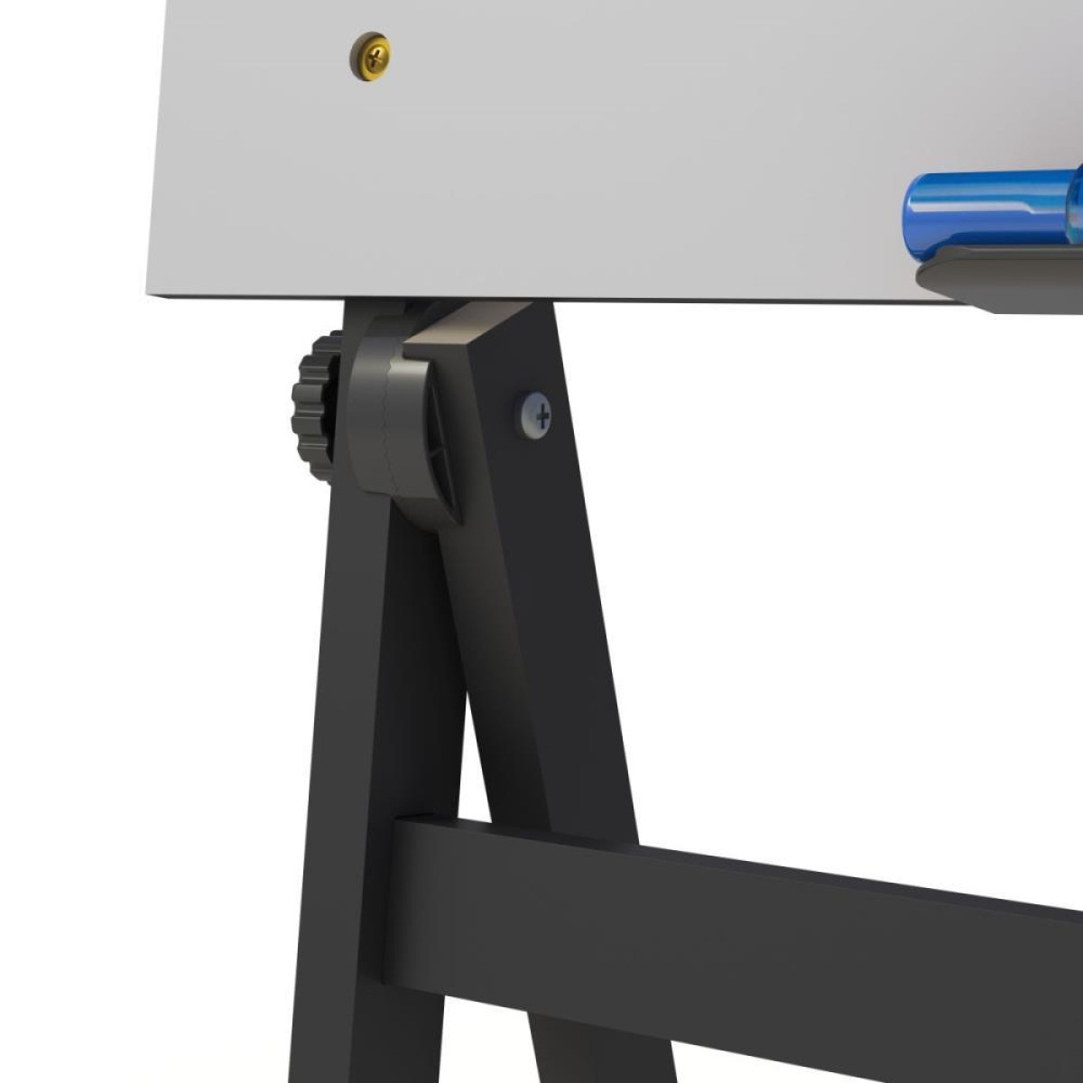 Acabamento com pontas arredondadas para melhor estabilidade, dois parafusos e dois manipulos com porca para fixacao do porta-blocos de papel, alem de um porta-caneta e apagador injetado em polipropileno, com 15 cm de largura.
