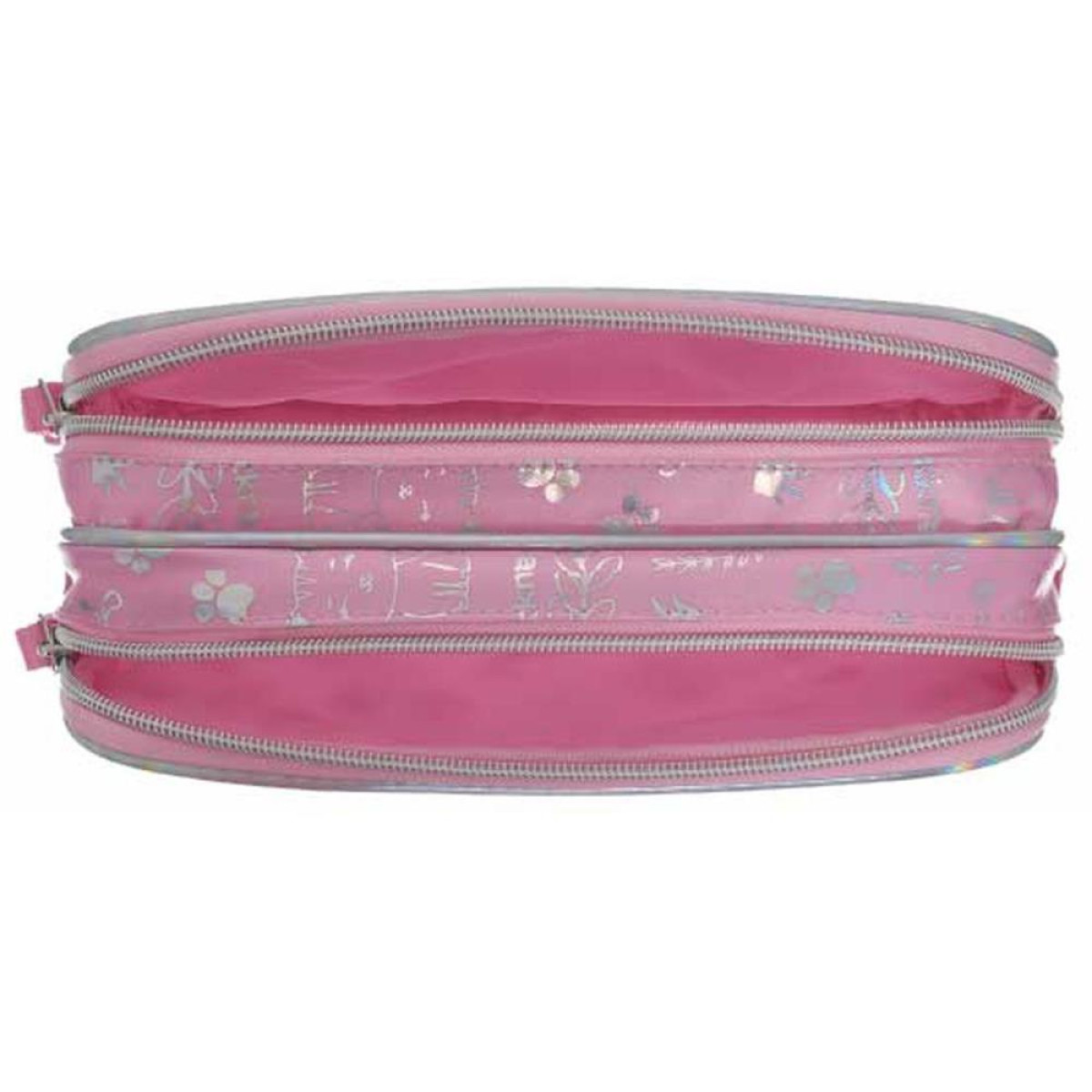 Colecao confeccionada em cetim com estampa corrida em foil. Painel frontal com impressao transfer com gradiente em PU com glitter.
