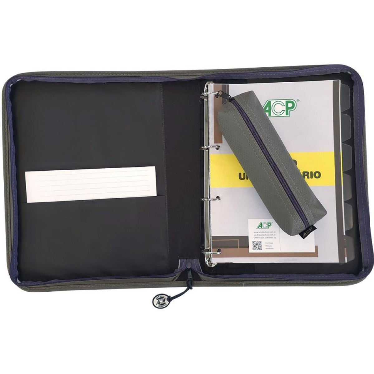 A parte interna do fichario pode ser removida e a capa vira uma pasta.