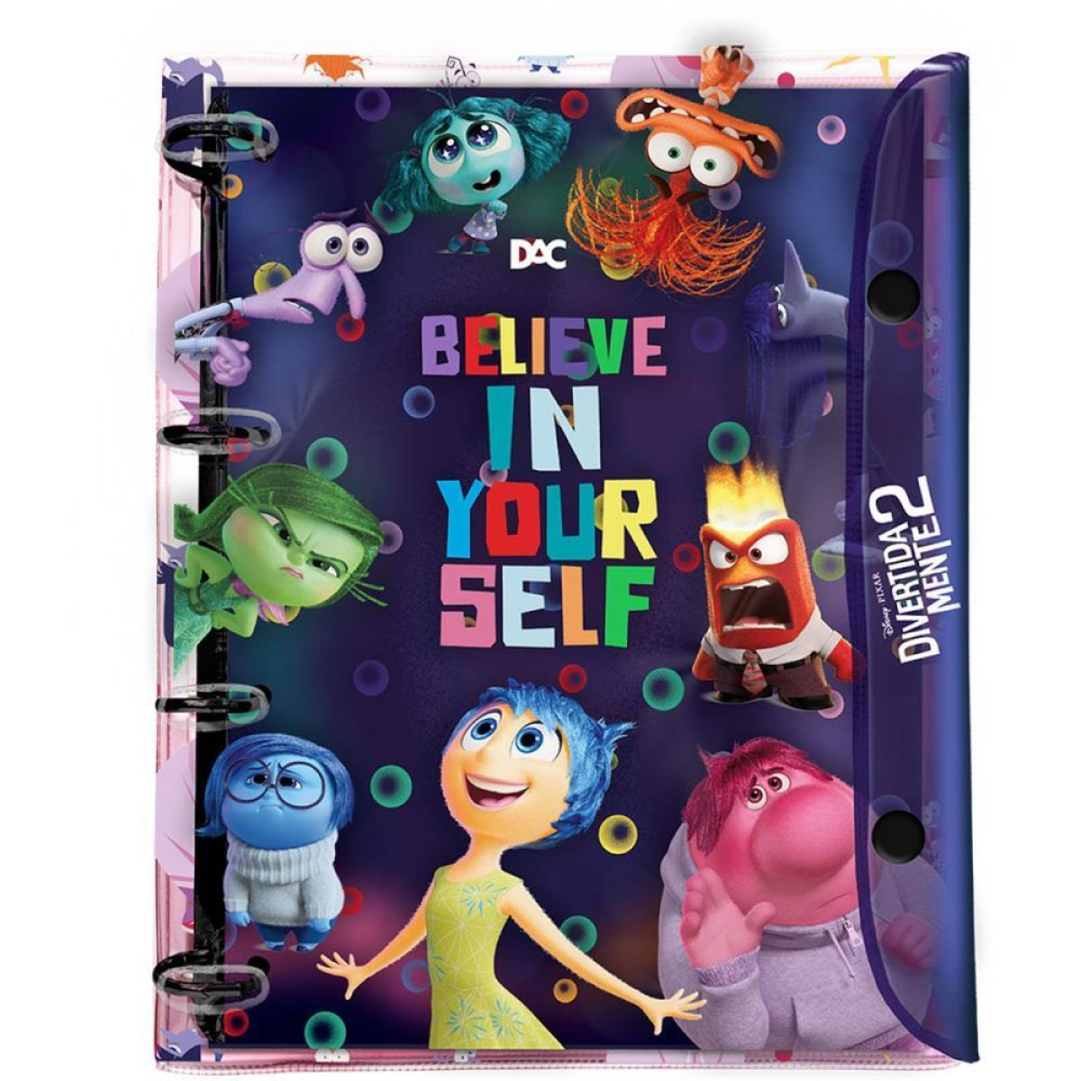 O Fichario Universitario PCV Cristal de Divertidamente com Botao e um sucesso em vendas pela sua inovacao, estilo e praticidade. E uma boa alternativa para quem quer o tamanho de um caderno, mas gostaria da versatilidade ao inserir ou retirar folhas, pois as argolas articuladas abrem, possibilitando esta acao. Contem ferragem fixa com 4 argolas e 192 folhas com gramatura de 56g.