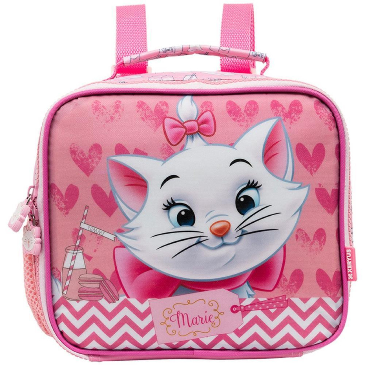 Lancheira Termica Marie.Confeccionada em poliester de alta densidade; ziper "trator" com puxadores persoanalizados emborrachados com icones da personagem. Possui alca "carona" nas costas possibilitando acoplar a lancheira na mochila com rodas. Possui alca de mao e alca para carregar como mochila . Estampa com glitter no propio poliester . Produto com certificacao do Inmetro Licenciado Original.