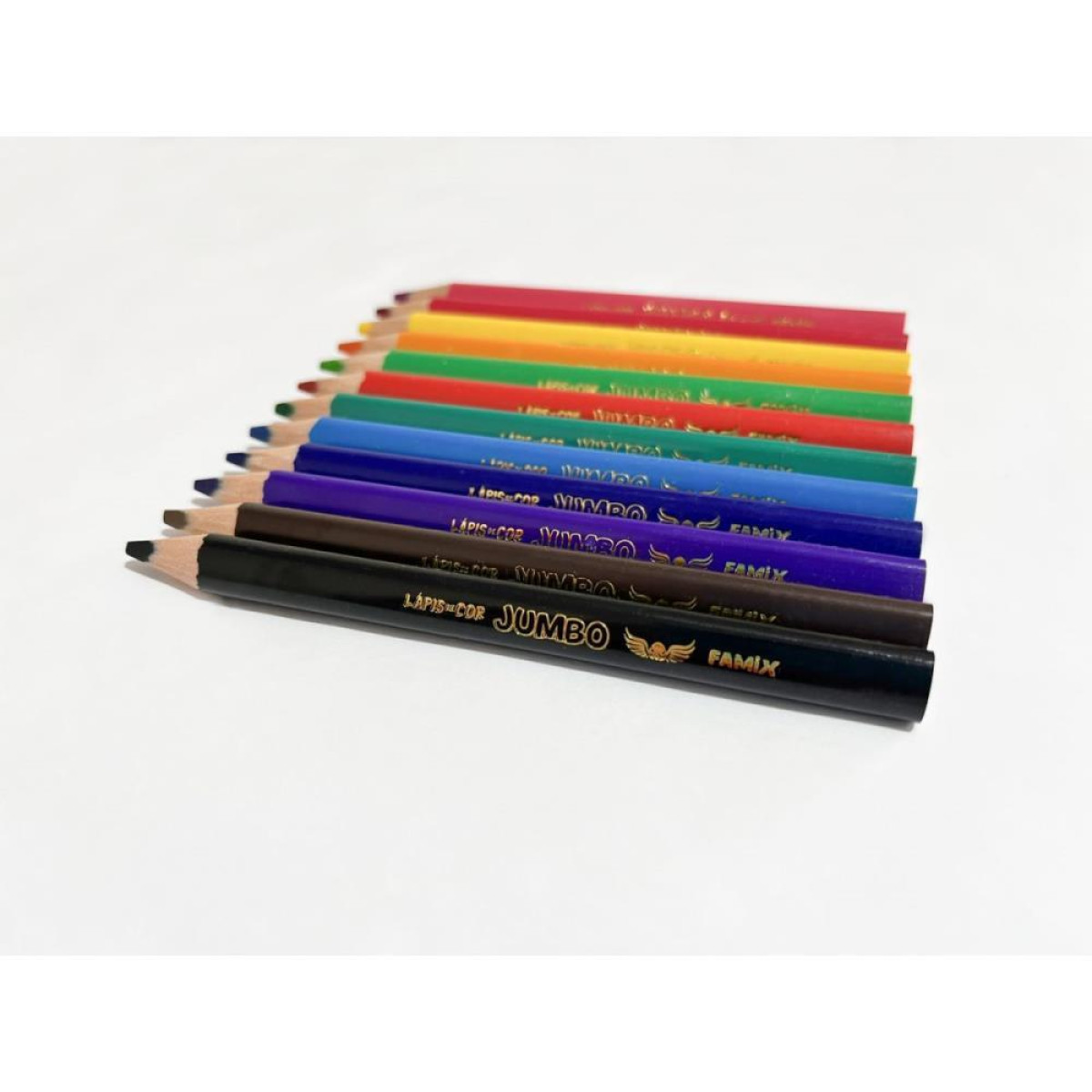 Lapis de cor Jumbo confeccionado com resinas termoplasticas virgens, atoxico, mina de 4,0mm, resistente, corpo triangular, com diametro de 9,96mm, comprimento de 125mm e peso de 8,6g por unidade, totalizando as 12 cores. Macio e de facil deslize no papel.